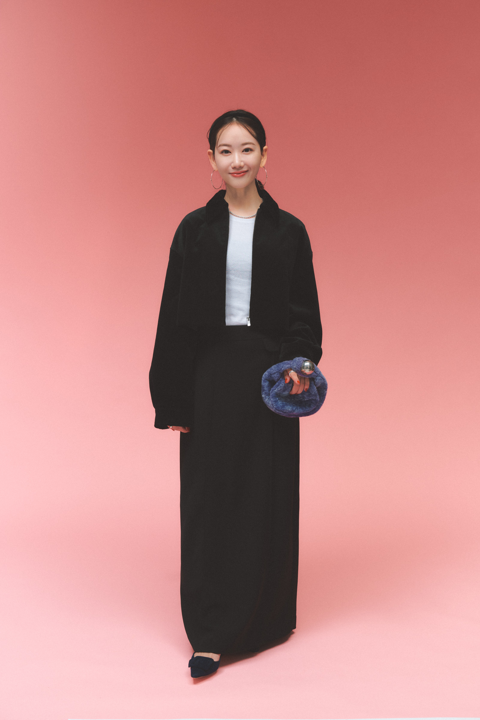 「セオリーのベロアブルゾンを主役に、モノトーンでモードな雰囲気にまとめました。単調に見えないよう、ファーやベロアなど異なる質感を重ねて奥行きを意識。アクセサリーは友人が手がけているブランド・ヒアーズのシルバージュエリーを合わせて、抜け感をプラスしました」
