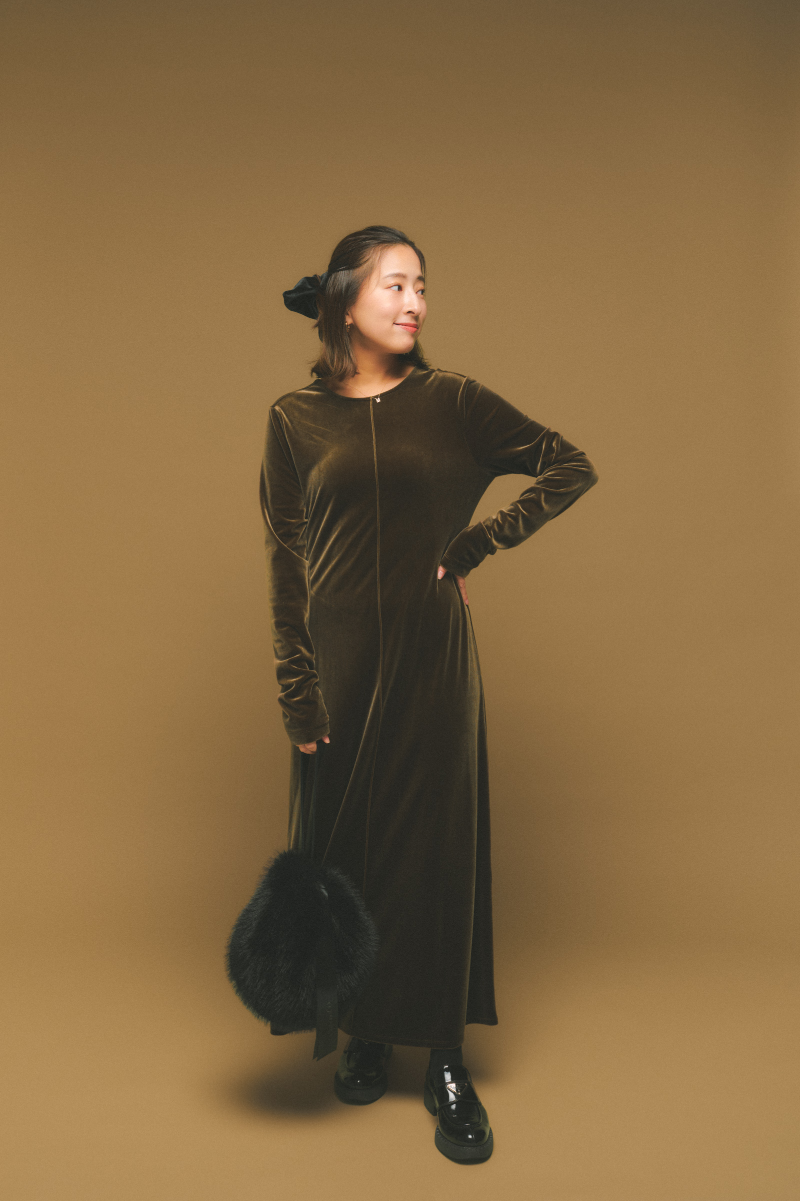 「旅行で頼れるのは、ユナイテッドアローズ グリーンレーベル リラクシングのベロアワンピ。一枚でスタイリングが決まるので、移動が多い日もストレスフリーに過ごせます。顔まわりはヘイップのシュシュでボリュームをプラス。他にはない大ぶりなサイズ感がアクセントになるのでお気に入り」