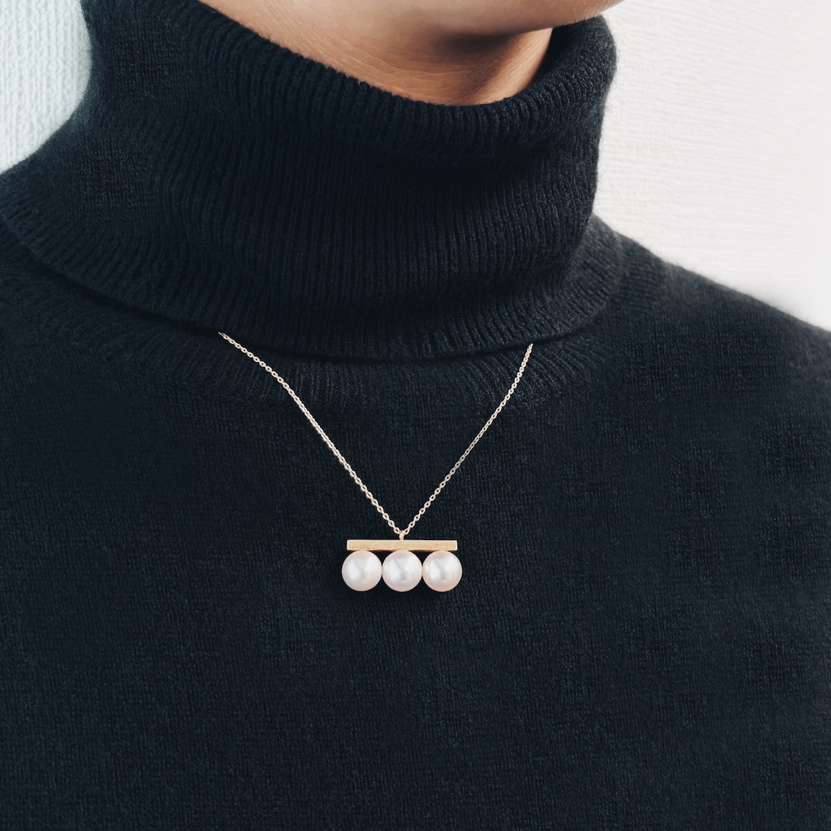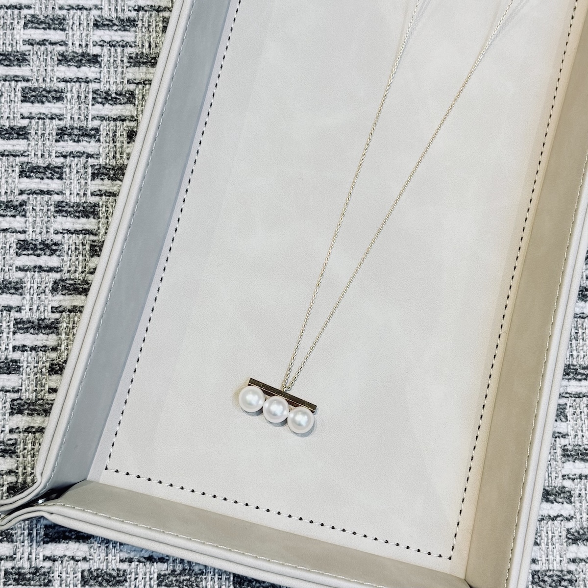 デザインの背景にあったのは、意外にも「バランスボール」というモチーフ。直線上にパールを並べたミニマルなデザインは、安定感と緊張感が共存するそのフォルムからヒントを得ています。装飾を足すのではなく、パールの並び方そのものに目を向けた発想が、パールジュエリーにこれまでにない自由な表情をもたらしました。