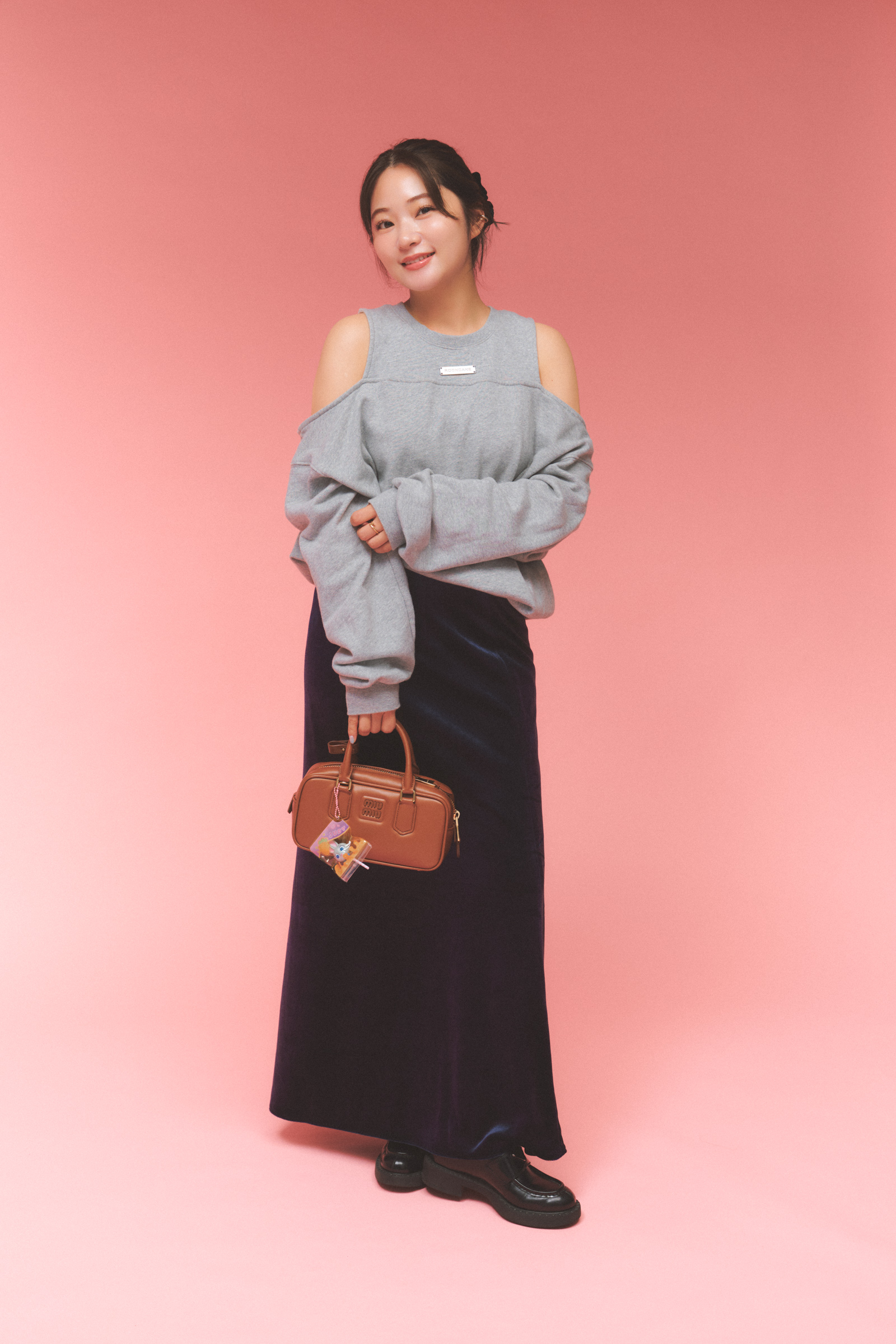 「休日に女友達とカフェに行く日は、トレンド感とリラックス感のバランスを意識。スウェットがカジュアルなぶん、他で引き締めるようにしています。Iラインスカートですっきりとしたシルエットにまとめて、スタイルアップも狙いました。小物はミュウミュウのバッグとプラダのローファーを合わせて、キレイめカジュアルに仕上げるのが今の気分です」