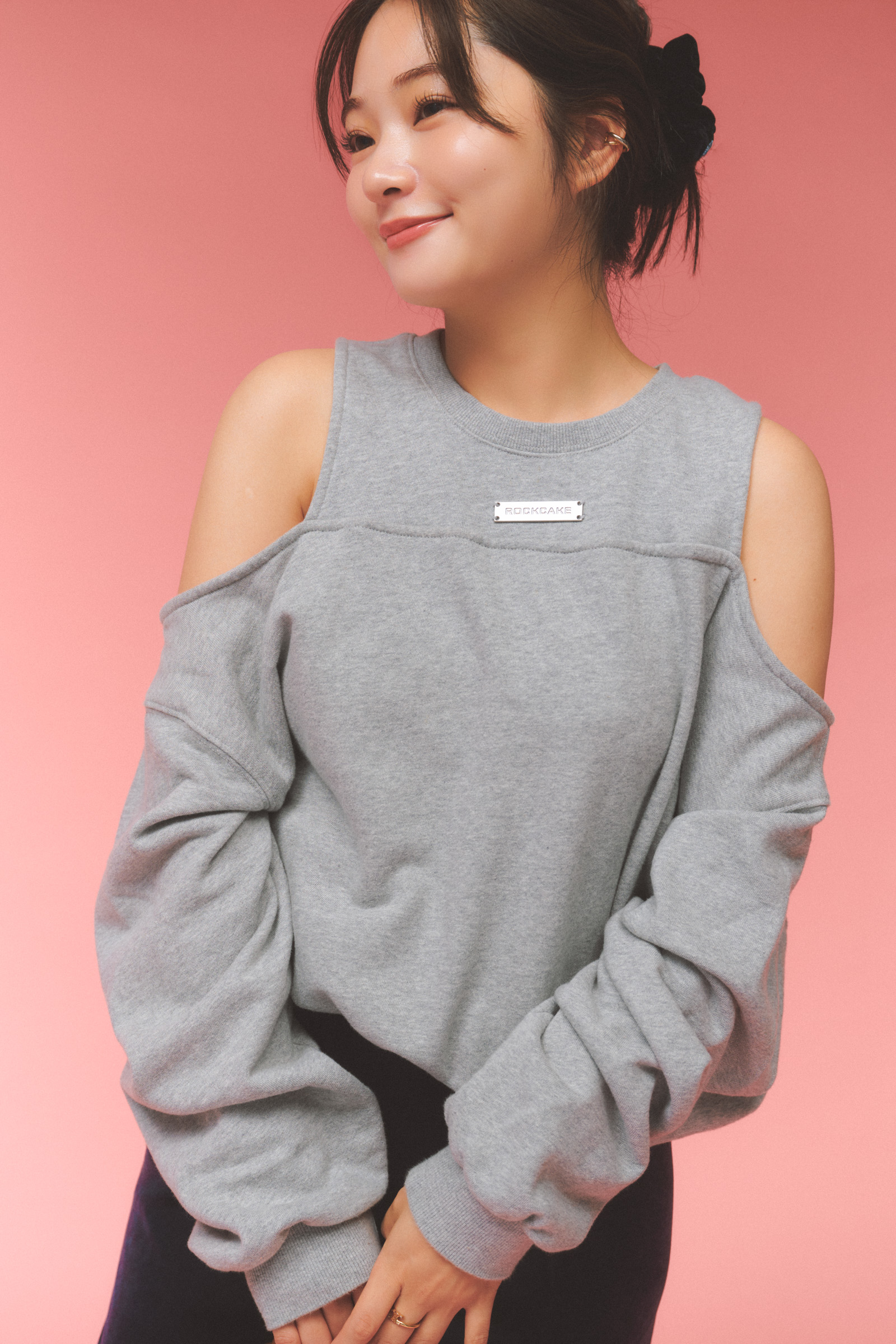 「年に数回は渡韓し、現地でチェックしたブランドを後からオンラインで買い足すことも。今注目しているのが、”ロックケーキ”。カジュアルと肌見せのバランスが絶妙なアイテムが揃っています。このスウェットも、肩が覗くデザインがほどよくヘルシーで、女っぽさのあるカジュアルに仕上がるのがポイント。トップスは1万円台のものが多く、取り入れやすい価格帯なのも魅力です」