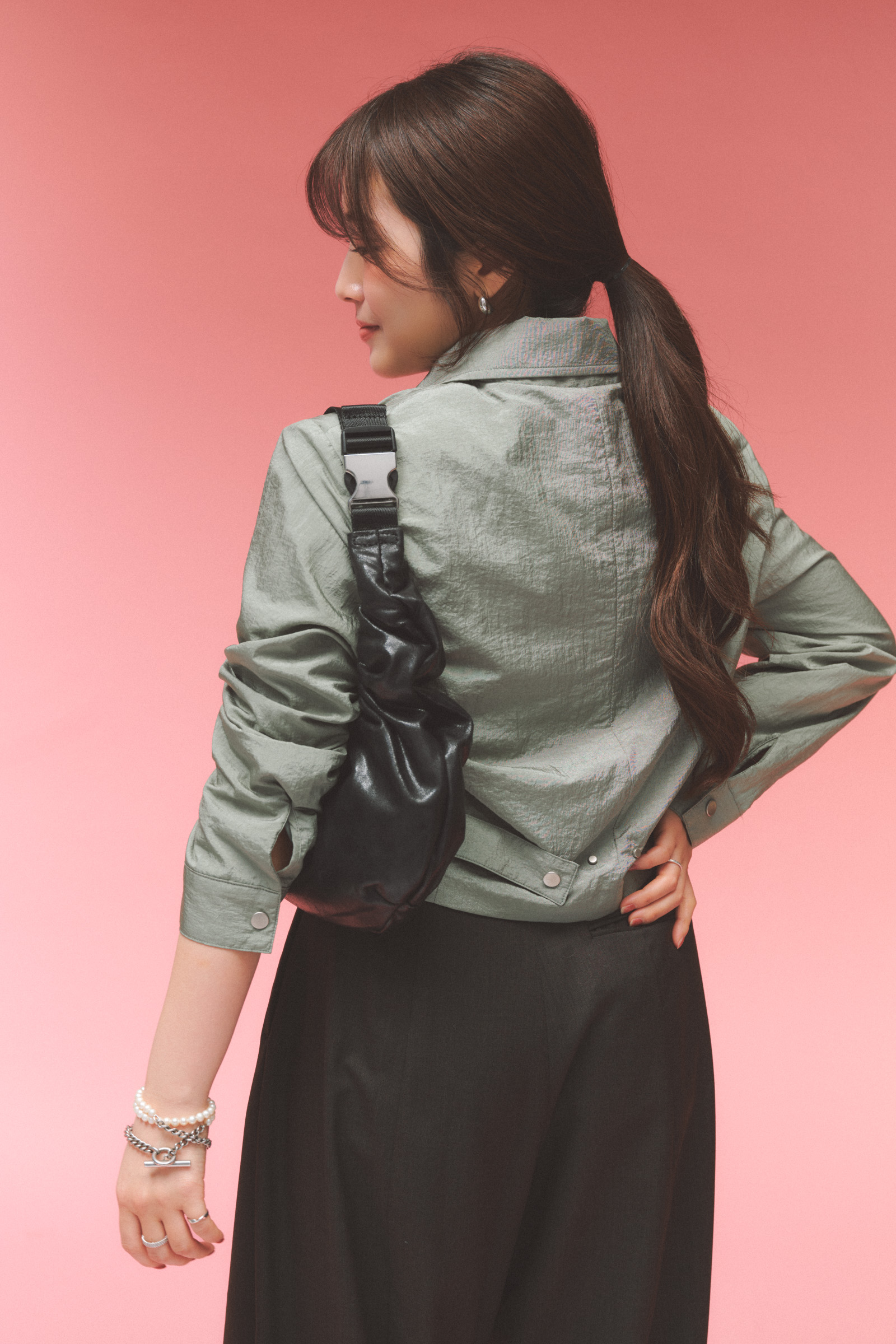 「軽やかなナイロン素材でも、衿付きデザインできちんと感をキープ。胸元のダブルポケットがシャツライクなアクセントに。H BEAUTY&YOUTHのボリュームパンツで裾をアレンジしつつ、トップス以外を黒で統一してメリハリあるコーデにしました」
