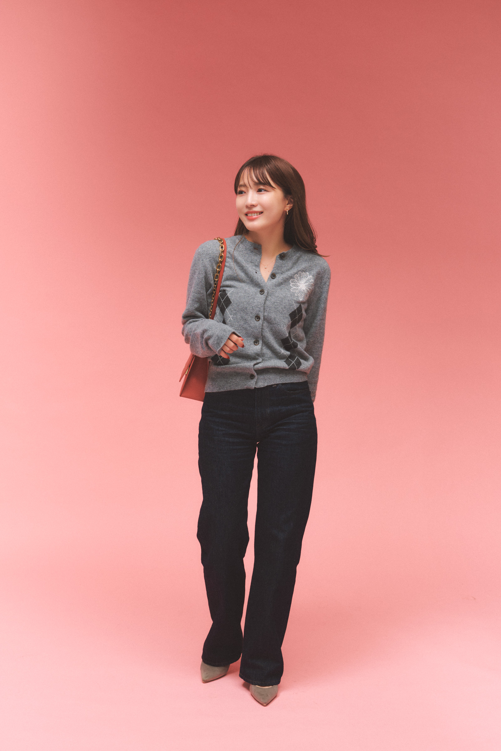 「マルディメクルディのニットは、ゆるっとした身頃と短丈デザインなので、デニムに合わせるだけでサマになります。シンプルなワンツーコーデでも、アーガイル柄と胸元ロゴのおかげで洒落感が出ます。足元やバッグできちんと感をプラスしました」