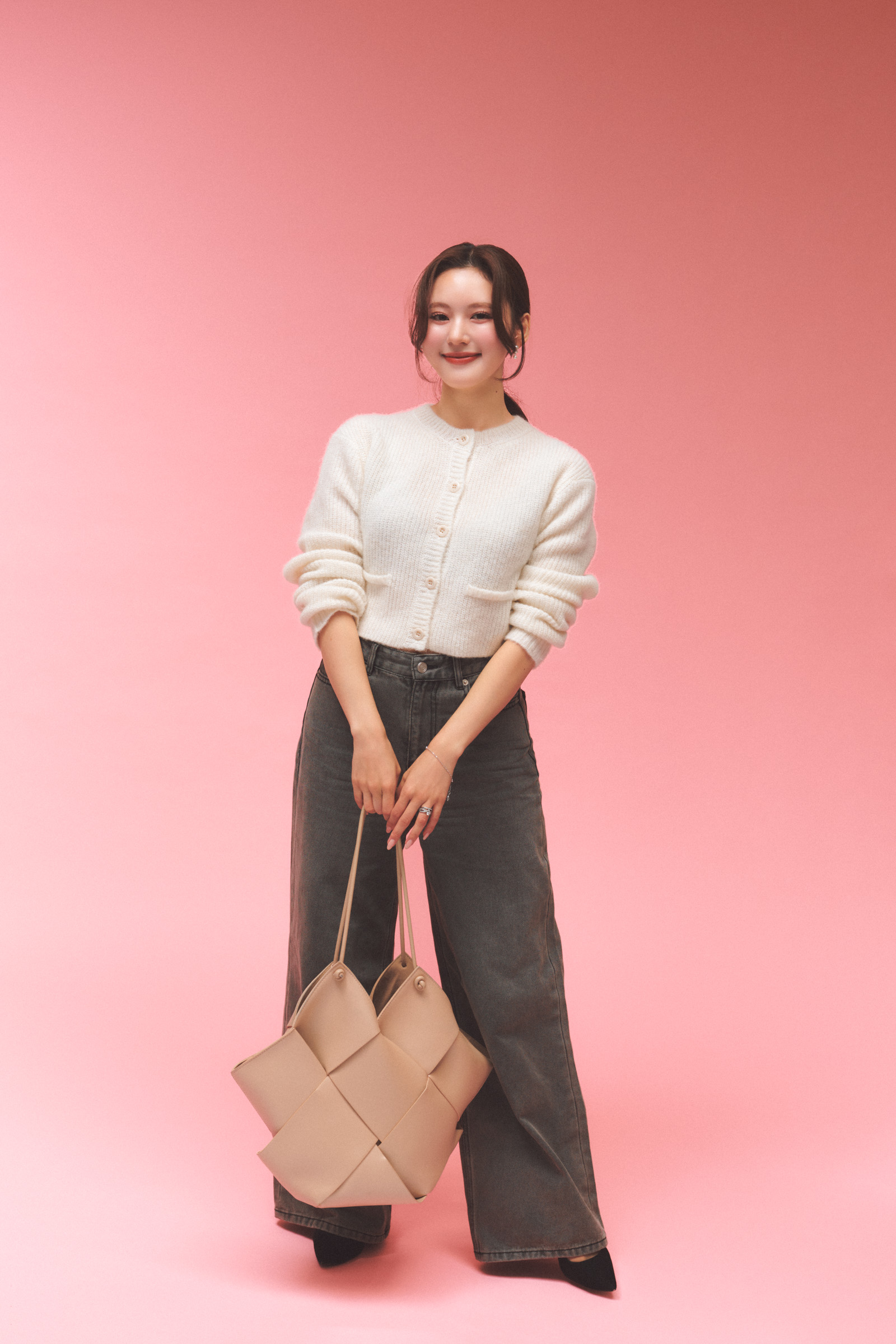 「ヌゥのカーディガンは、ベビーアルパカ素材で肌触りがよく、軽くてストレスフリーな着心地。短丈なのでデニムとのバランスも取りやすく、1枚でさらっと着てもサマになります。動きやすくて暖かいので、お花見やホームパーティなど、座る時間が多い日にも重宝しています」
