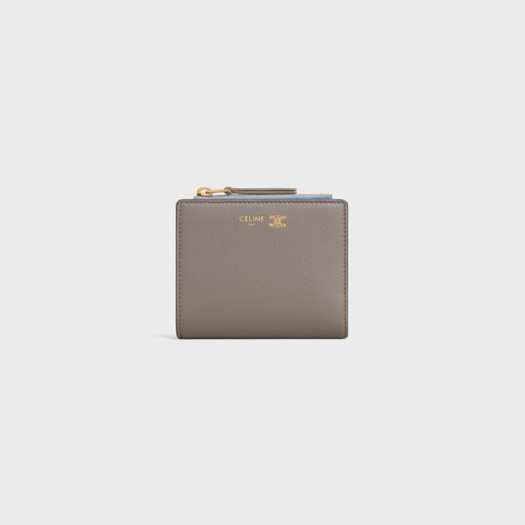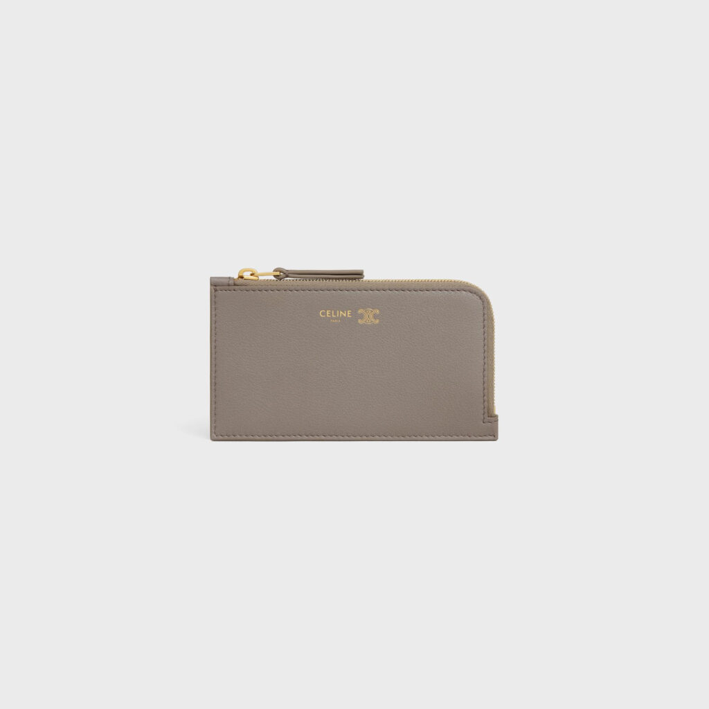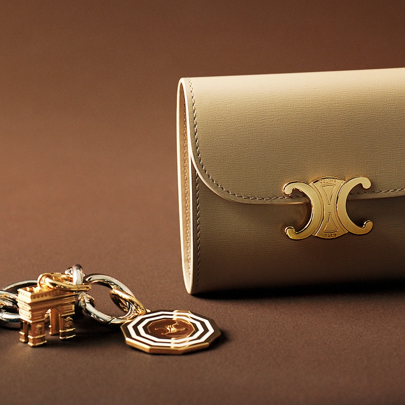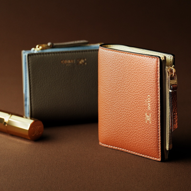 新たに登場した「コンパクト ウォレット」は、厚みわずか2cmのスリムな設計。バッグの中でもかさばらず、ミニバッグ派にも嬉しいサイズ感が魅力です。コンパクトながら、カードスロット4つ、フラットポケット2つを備え、収納力も十分。フロントにはセリーヌのロゴとメゾンの象徴「トリオンフ」があしらわれ、外装とライニングのカラーコントラストが洗練された印象を演出します。