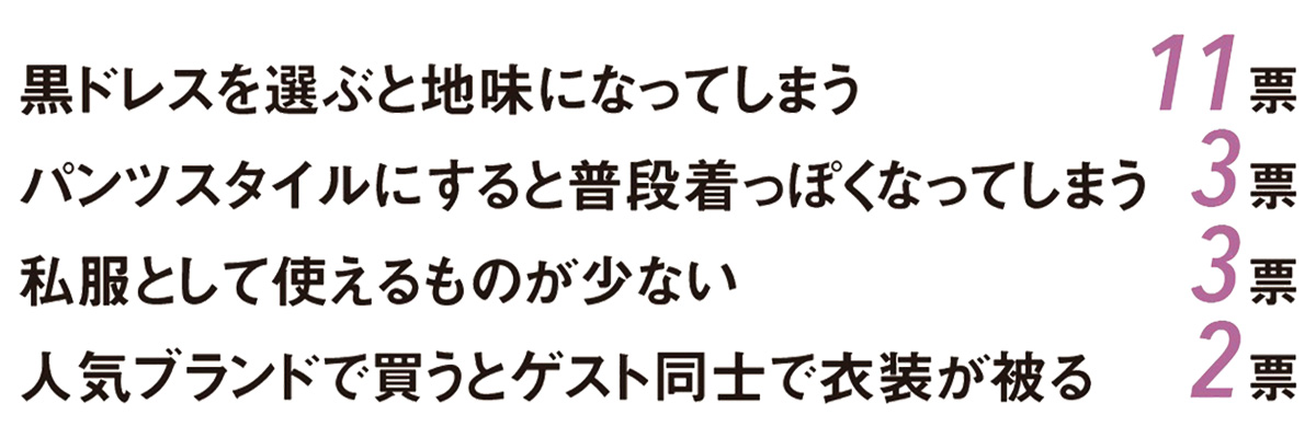 つい選びがちな黒服の地味見え問題が多数。気づいたら会場のゲストみんなが黒ドレスだった…なんて経験がある人も多いのでは?