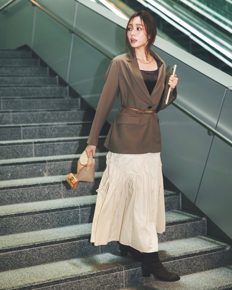 12月25日(木)、平日だけどせっかくのクリスマス。ロマンティックなティアードスカートで、いつもより少しだけ華やかな気分を取り入れて。甘めなスカートには、きちんと感のあるジャケットを合わせて仕事モードはしっかりキープ。ウエストベルトでメリハリをつけつつ、ゴールド金具のミニバッグで上品な女らしさをプラスすれば、「平日クリスマス」にちょうどいい大人のホリデーコーデです。