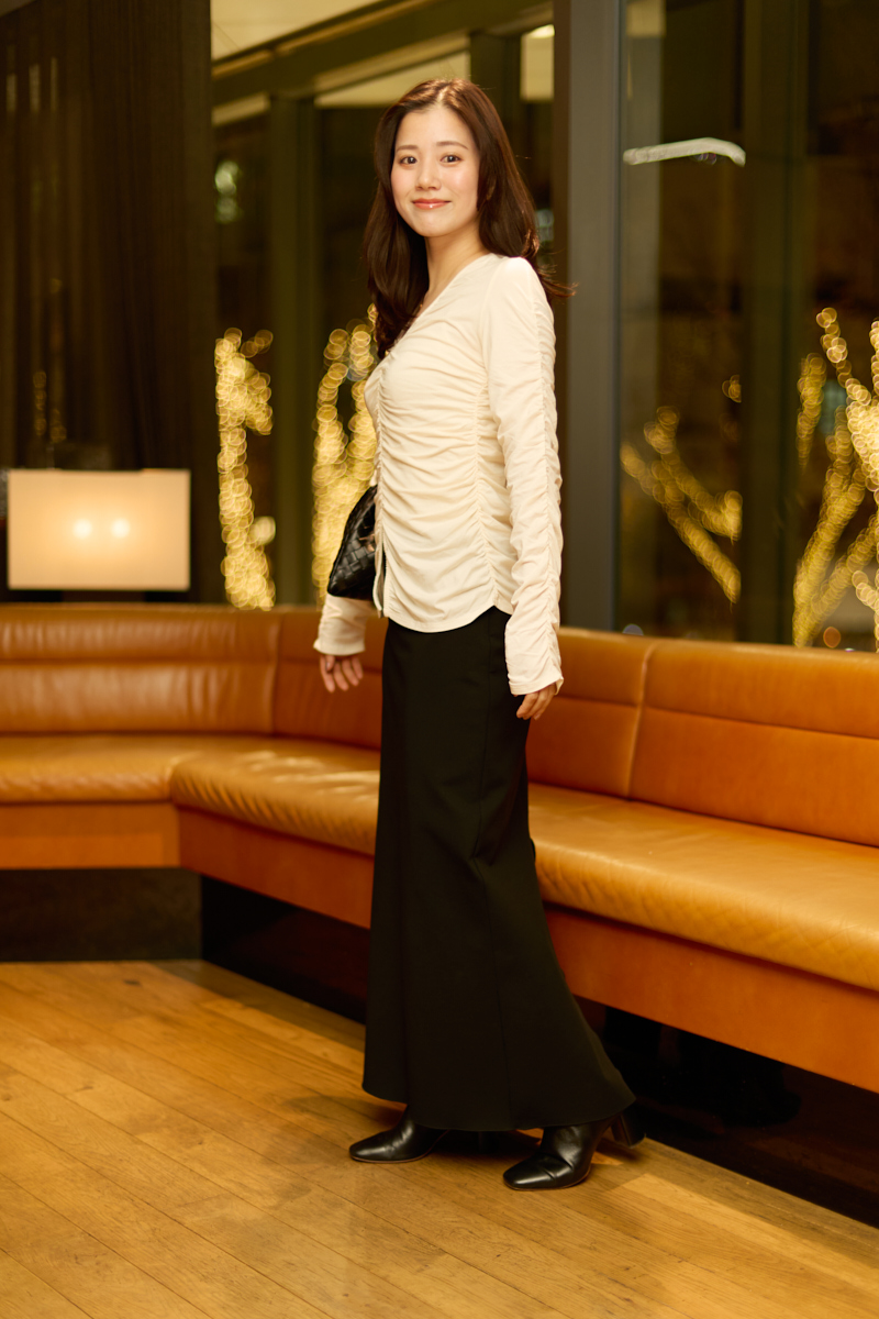 「ミースロエの白のギャザートップスは、Vネックで女性らしさと抜け感が出るところがお気に入りです。きちんと感がありながらリラックスして着られるので、忘年会にピッタリだと思い選びました」
