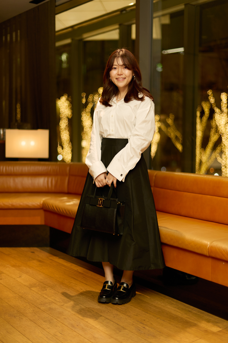 「祖母のお下がりのフェラガモのヴィンテージバッグに合わせてコーデはクラシックな雰囲気にまとめました。ドゥーズィエムのシャツはカフスがつけられるのがお気に入りで、祖父のDiorのカフスを付けています。クラシックな雰囲気もモードな感じでも、いろいろな着回し方ができるのでお気に入りのシャツです」