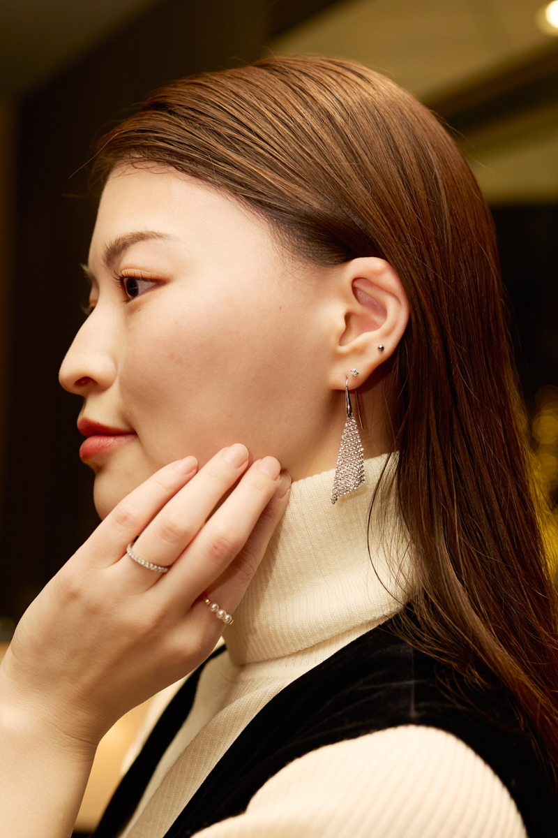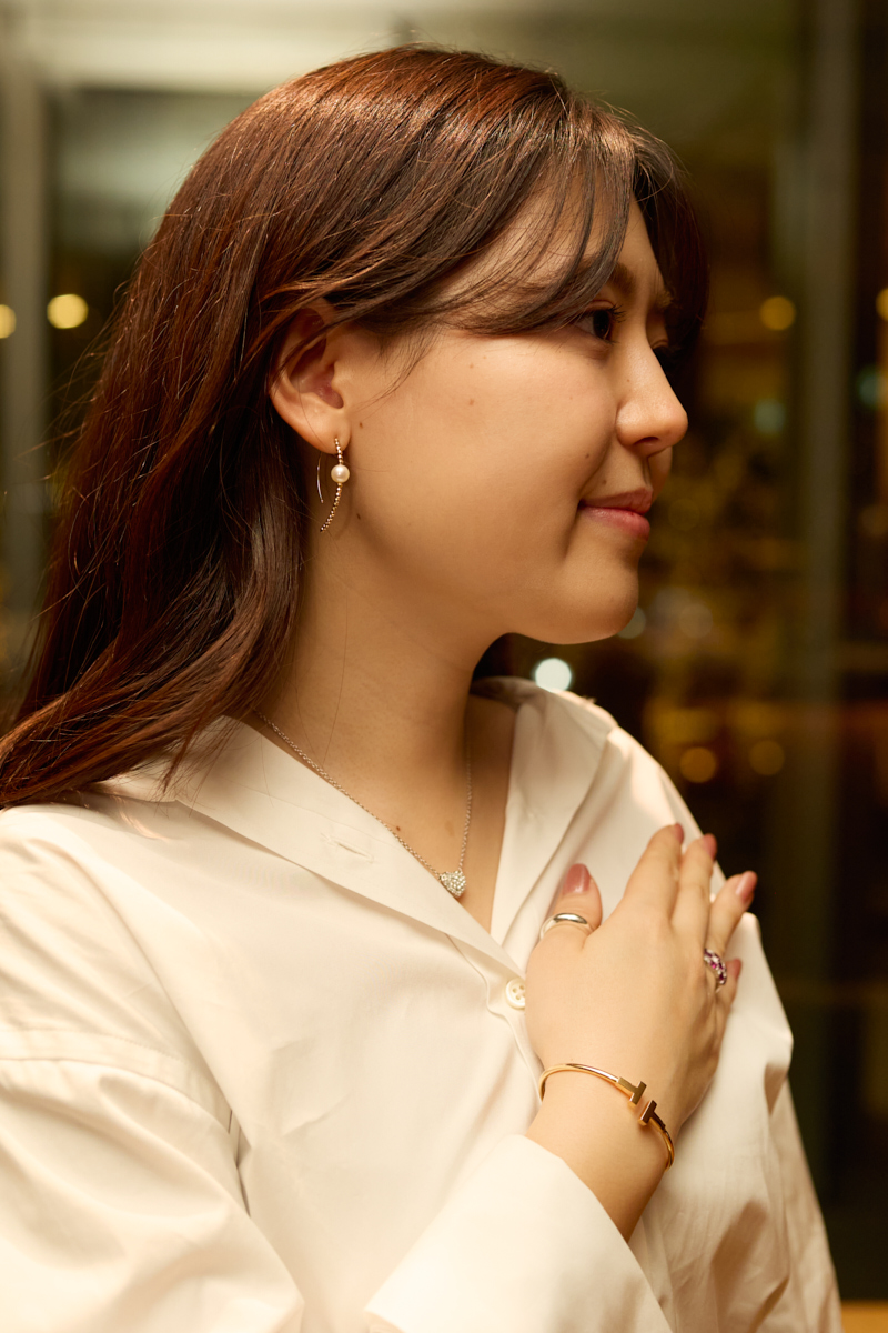 「今日身につけているジュエリーの中でのお気に入りはピアス。MIZUKIのもので、母が持っているのに憧れていて今年ボーナスで購入しました」