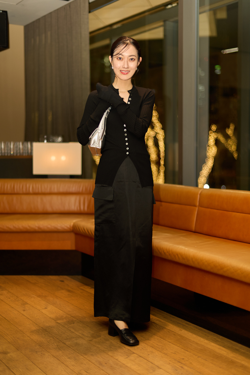 「オールブラックのコーデはシンプルになりすぎることが多いので、シルキーなポケット付きスカートや上下にボタンを広く開けたタイトなリブカーディガンを合わせて単調にならないようにディテールにこだわったアイテムをチョイスしました」