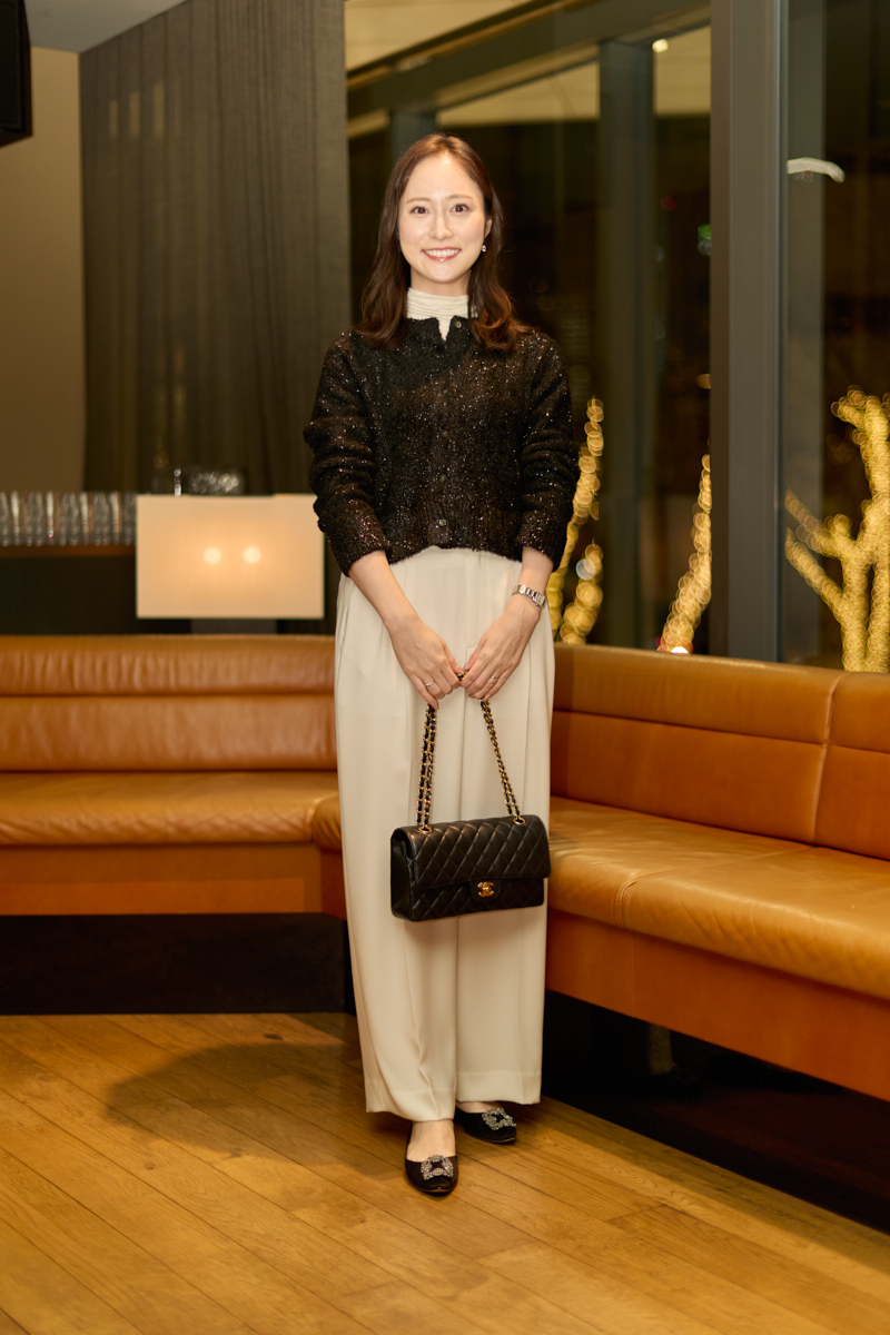 「ラメカーディガンは、きちんと感がありつつ1枚で華やぐので、仕事帰りの平日忘年会にぴったりです。パーティファッションでは、写真映えするように顔まわりが華やかなトップスにして、両手が空くチェーンバッグなどでグラスやお皿を持てるように気をつけています」