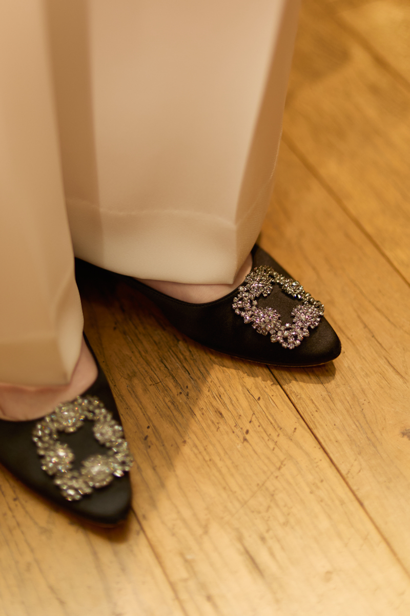 「マノロのパンプスはキラキラビジューの存在感が決め手。カジュアルなデニムにもキレイめなお洋服にもシーンを問わずはける万能パンプスです」