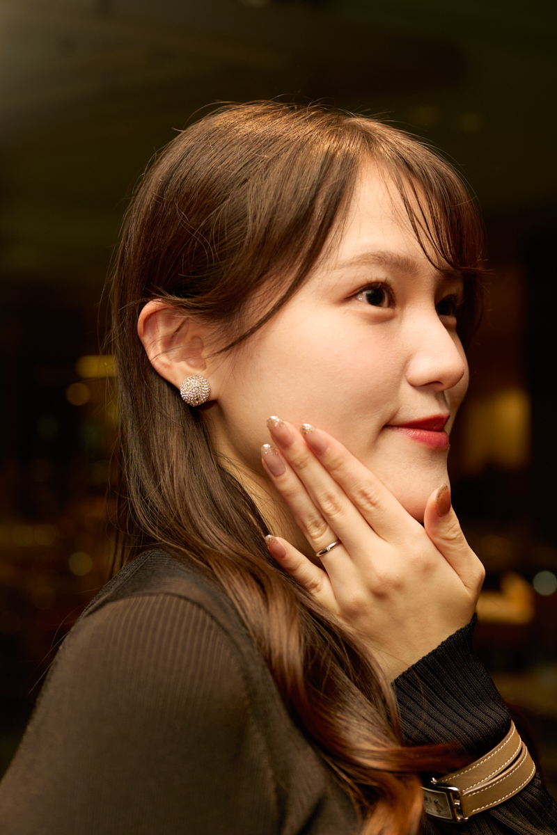「ネイルは、ラメやミラーのデザインでキラキラさせるのがお気に入り。ケイトスペードのイヤリングは2年ほど前に友人からもらったもの。女子会やホテルディナーでも大活躍しています」
