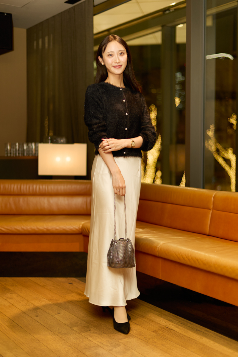 「ラメの入ったニットカーディガンは一枚でサマになるのでお気に入り。プチプラとは思えないくらいしっかりしていて、年末年始の集まりやちょっとしたイベントにピッタリです。サテン生地のタイトスカートとの相性もよくたくさん着回したいです。パーティファッションでは肌見せはあまりせず、素材や色、形で遊ぶようにしています」