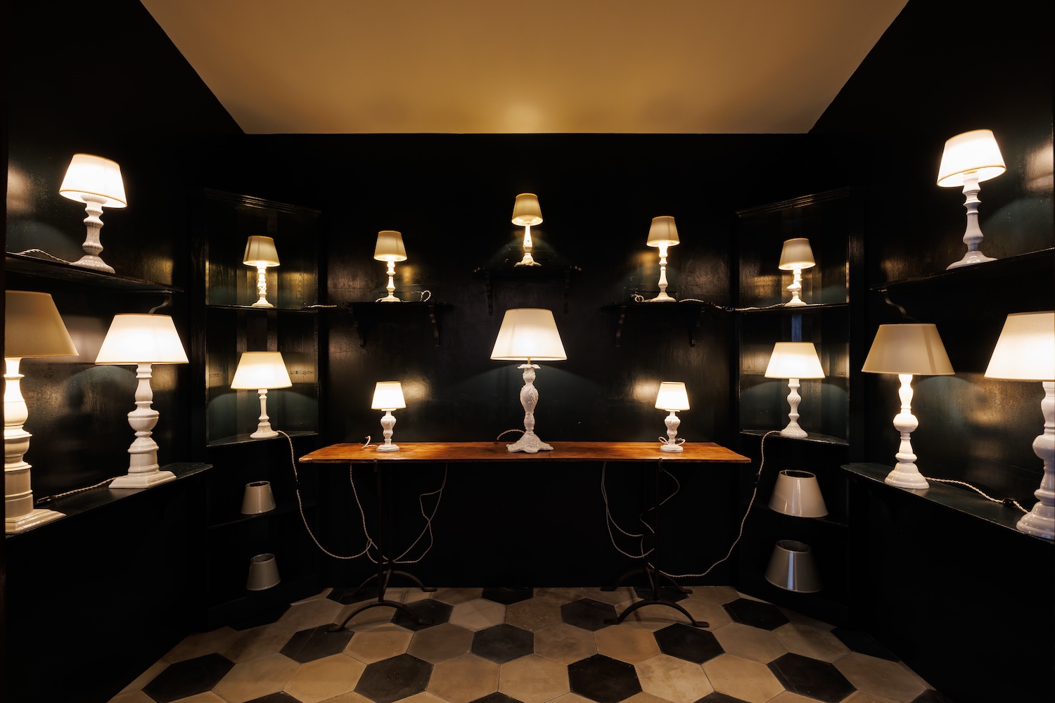 奥の小部屋には、大小さまざまな白い陶器製ランプが並び、幻想的なムードを演出します。