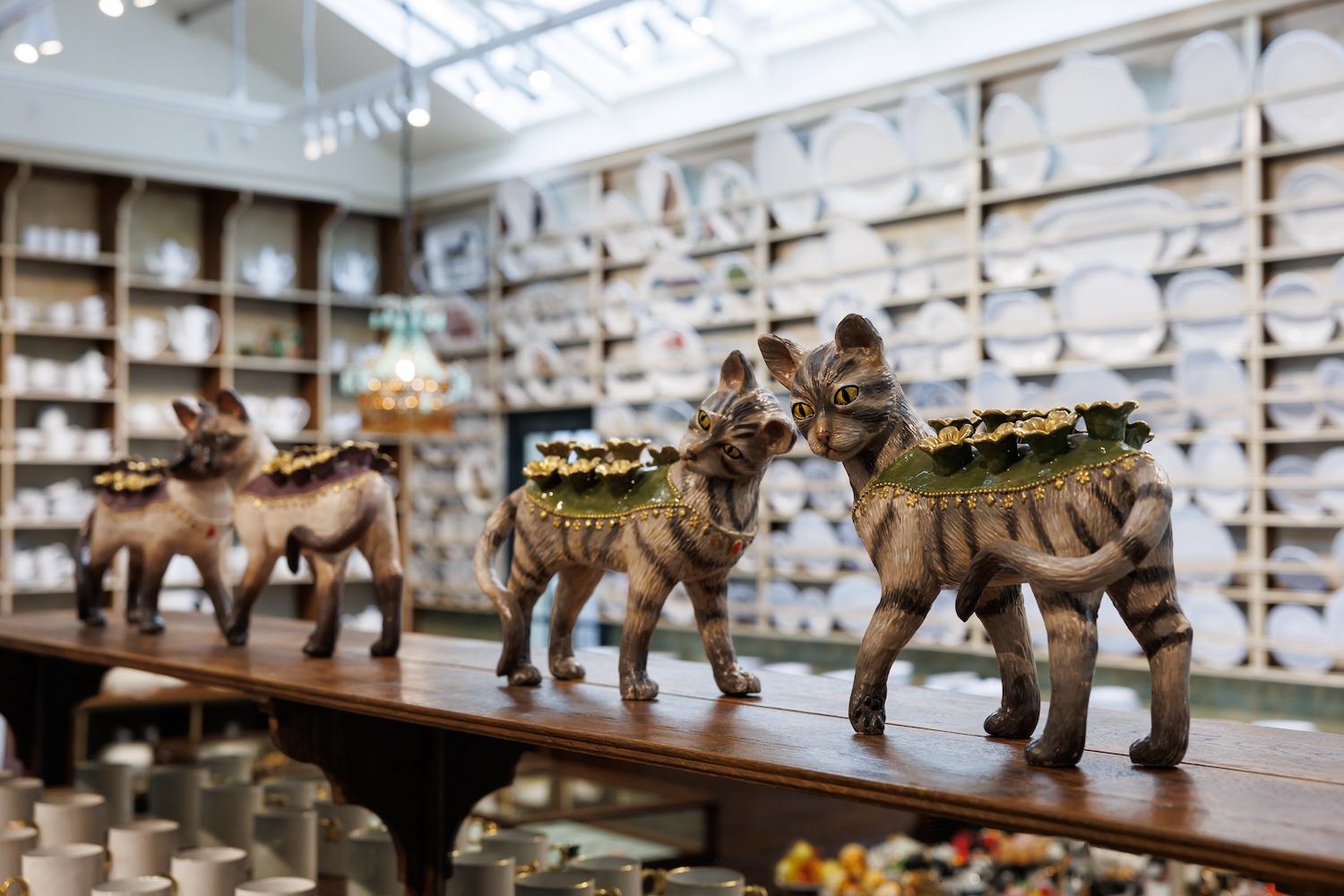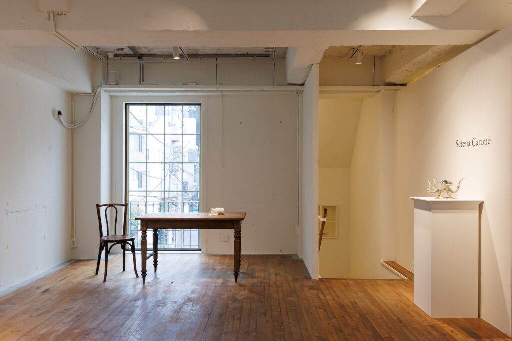 ブティック上階に設けられたアートギャラリーでは、彫刻家セレナ・キャロンヌの個展を開催。陶器にハンドペイントエナメルを施した作品は、本物と見紛うほどリアルでありながら、どこか不思議な緊張感を宿します。インク壺が倒れた白いシャツ、鍋から溢れ落ちるスパゲッティ、歪んだエスプレッソメーカーから吹きこぼれるコーヒー——日常の一瞬を切り取った作品群は、鑑賞者の想像力を刺激。猫をモチーフにした花器作品も展示され、アートとユーモアが共存する世界観を楽しめます。