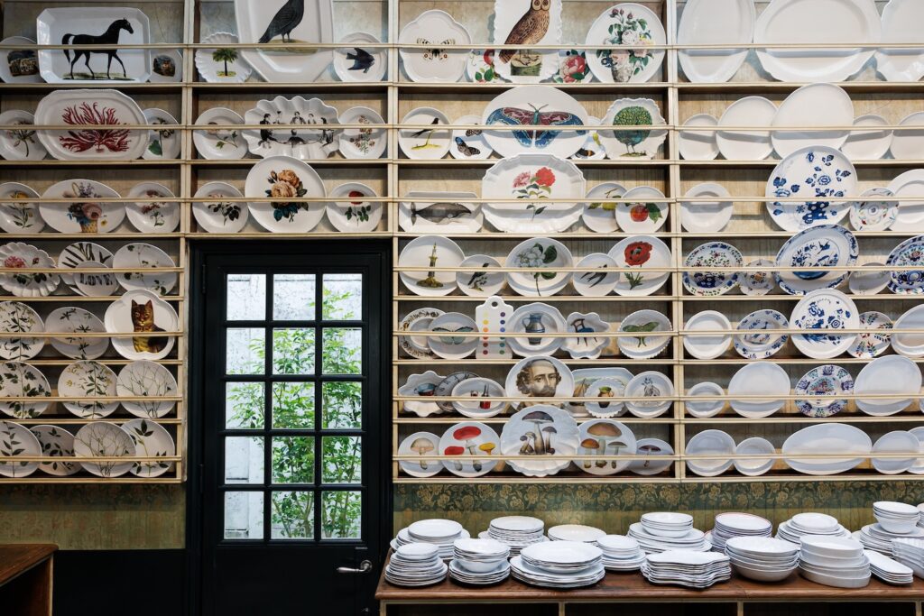 大きなガラス窓から自然光が差し込む店内には、アスティエ ド ヴィラットを象徴する白い陶器のテーブルウェアをはじめ、キャンドルホルダー、ゴブレット、リングカップなどが美しく並び、ブランドの世界観を存分に堪能できます。