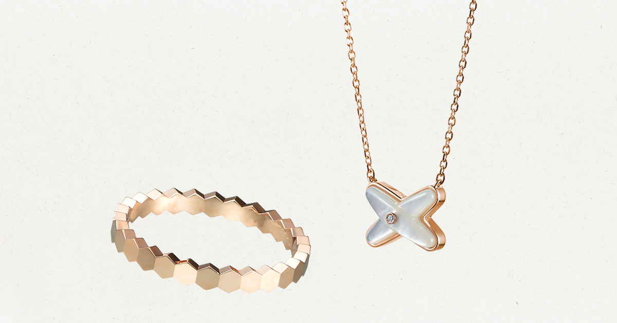 地金のコンビネーション、ダイヤモンドの輝きのリズム…身に着ける人の個性や歴史を物語るものに。 「ビー ドゥ ショーメ」コレクション ペンダント〈PG×D〉¥559,900、「ビー ドゥ ショーメ」コレクション ハニカムリング〈YG×D/2.5mmハーフ〉¥451,000、「ビー ドゥ ショーメ」コレクション ハニカムリング〈WG×D/4mm〉¥364,100(ショーメ)