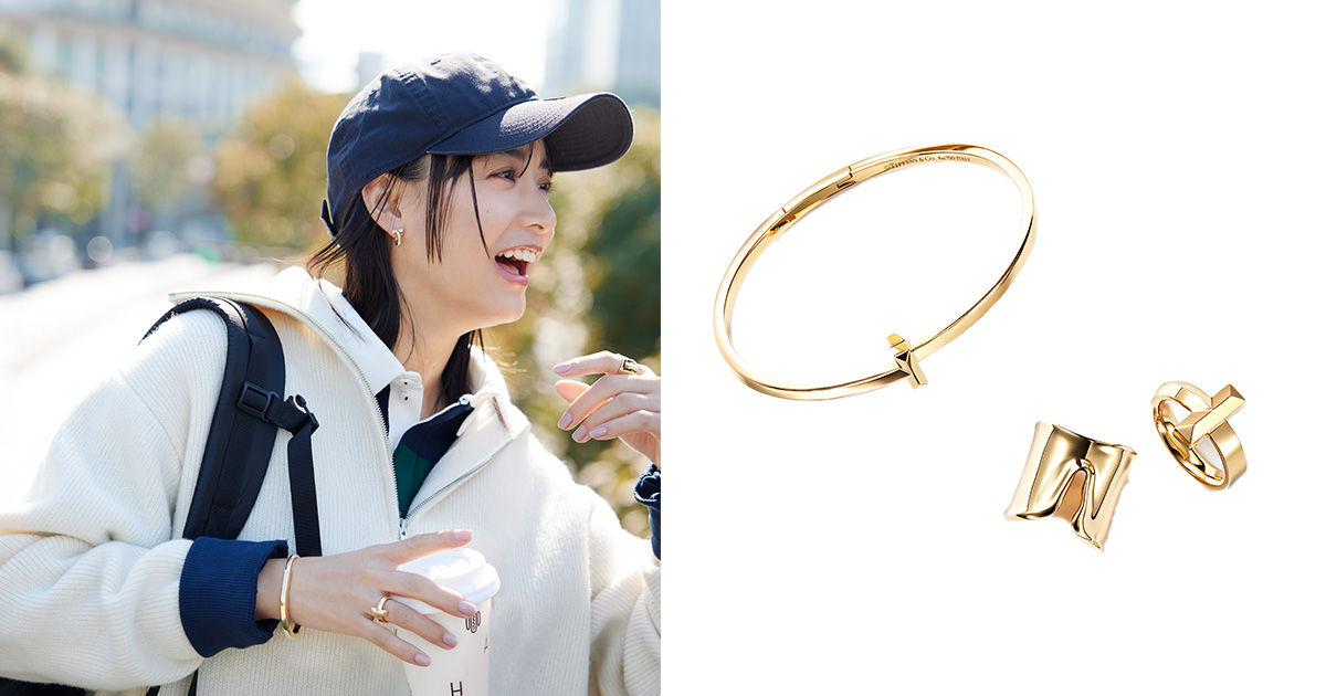 誰とでも自然に笑い合える人。そんな親しみやすい魅力を映すのは、ティファニーのジュエリー。ニューヨークの街のように、自由で、前向きで、どこか軽やか。そのポジティブなエネルギーを象った「ティファニー T」をはじめとする、アイコニックなデザインの軌跡をたどって。右腕バングル「ティファニー ロック」バングル〈YG〉¥1,232,000 右薬指リング「ティファニーT ワン」リング〈YG〉¥495,000 左人差し指リング「エルサ・ペレッティ™」スプリット リング〈YG〉¥819,500 着用ピアス「ティファニー T ワン」フープ ピアス〈YG×D〉¥797,500(すべてティファニー/ティファニー・アンド・カンパニー・ジャパン・インク)ニット¥25,300(アニュアル/ジャック・オブ・オール・トレーズ プレスルーム)プルオーバー¥13,200〈ローガン ニッティング ミルズ × シップス〉キャップ¥4,620〈ニューエラ × シップス〉(ともにシップス インフォメーションセンター)バックパック¥12,100(オーバーラボ)