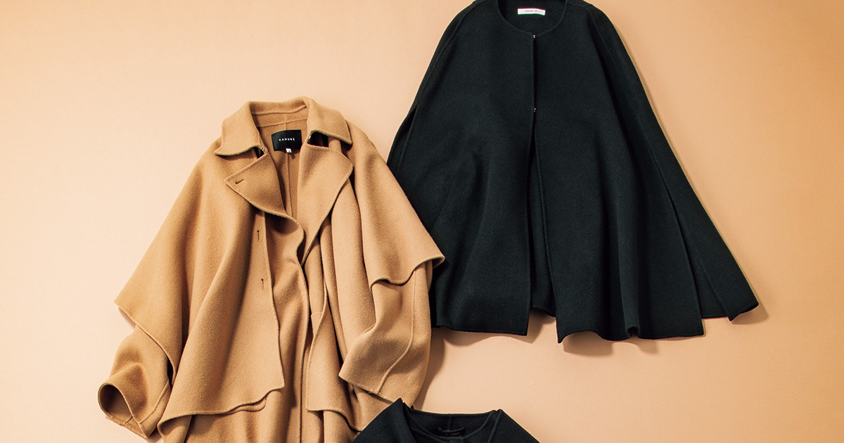 ケープ風のストールが一体となったデザインのリバーコート。動くたびに揺れる立体的なフォルムがエレガント。着こなし方が何通りもあり、コーディネートに合わせて楽しめます。ストールは取り外し可能でアレンジも自在。コート¥66,000(カデュネ/カデュネ プレスルーム)