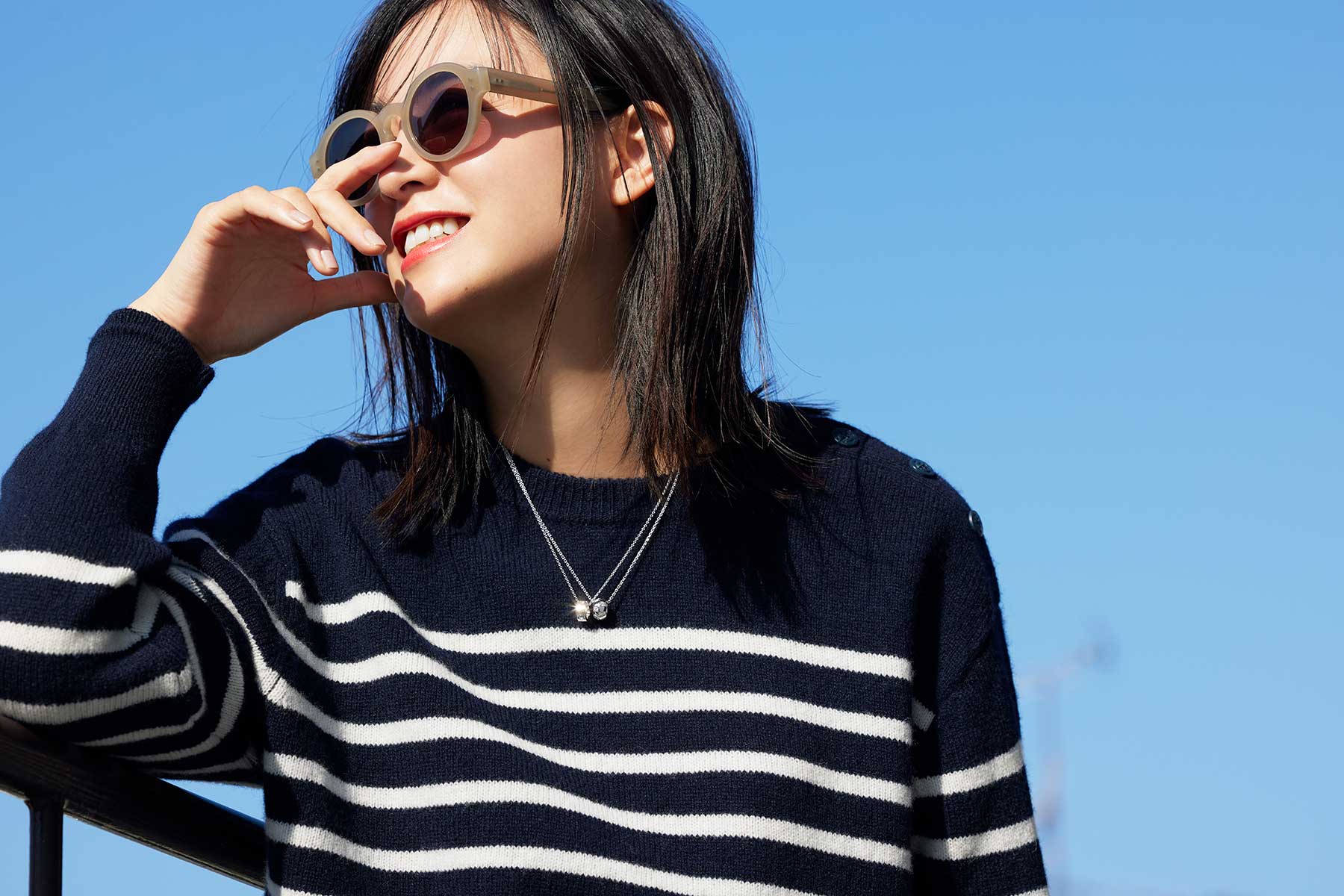 ダミエやモノグラムなど、メゾンを象徴するモチーフを地金で軽やかに仕立てたジュエリーは、カジュアルな抜け感がありながらディテールには確かなセンスとクラフツマンシップ。肩の力が抜けているのに、どこか品がある——そんな“気取らないけどおしゃれな人”という第一印象を自然に叶えて。モデル着用右「ペンダント ル ダミエ ドゥ ルイ・ヴィトン」〈WG×D〉¥1,089,000 モデル着用左「ペンダント アンプラント」〈WG〉¥510,400 (すべてルイ・ヴィトン/ルイ・ヴィトン クライアントサービス)サングラス¥48,400(プロポ/プロポデザイン)ニット¥12,100(デッサン/ワールド プレスインフォメーション)