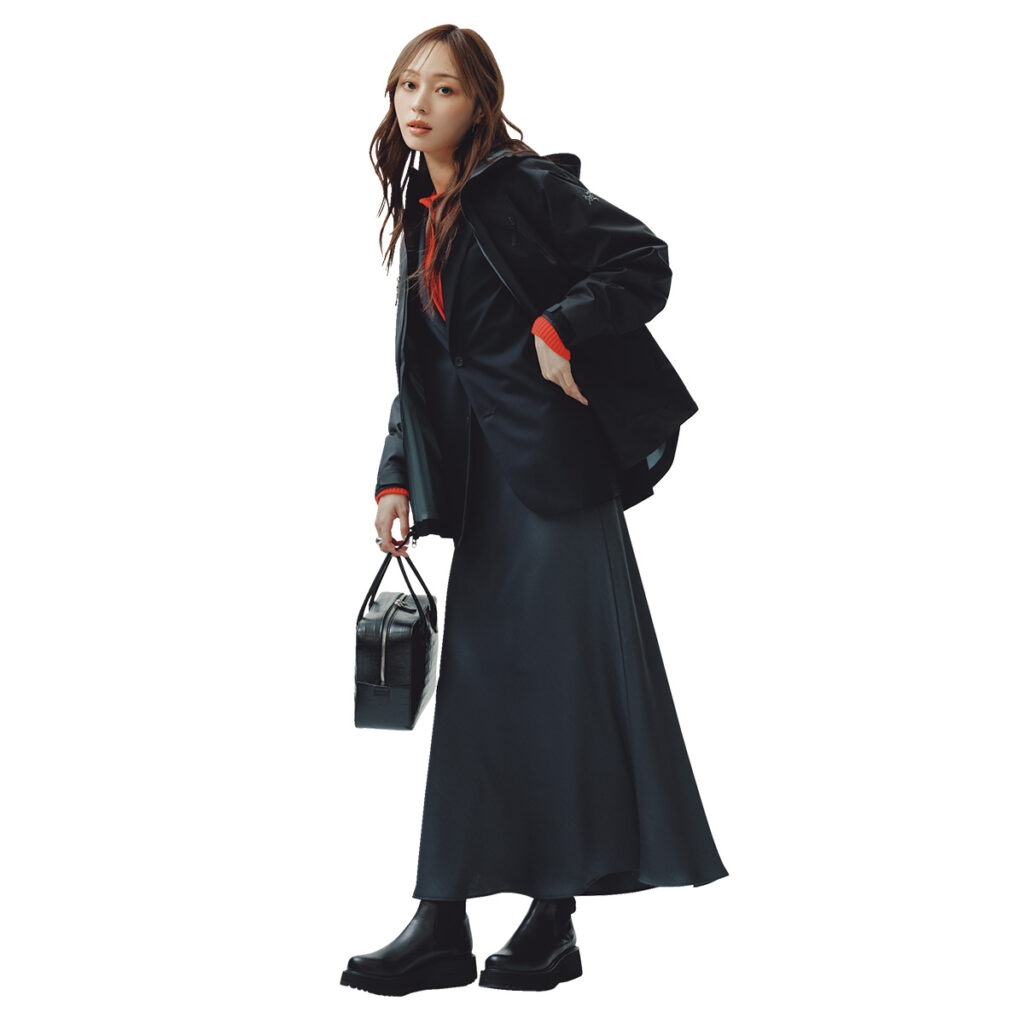 通勤でおなじみの黒アウターをアウトドア仕様にして、フレッシュに更新するのも手。ジャケットをインに重ねたレイヤードがきちんと見えをキープしつつ、赤ニットの差し色がさりげなく存在感を放ちます。ロングスカートとブーツを黒で統一すれば、実用性と洗練を兼ね備えつつ“ひとひねり効いた”スタイルに。