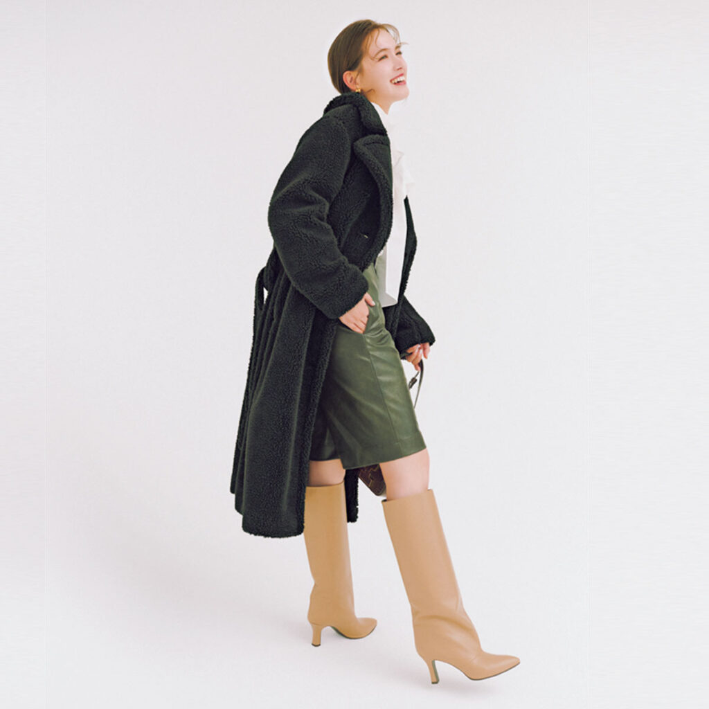 ボリュームのある黒のボアコートは、白ブラウスの清潔なトーンやカーキのボトムスで軽やかに着こなすのが正解。足元にベージュのロングブーツを合わせれば、濃い色のアウターでも重さが出にくく、都会的な抜けが生まれます。異素材をミックスした組み合わせが、冬の黒アウターに上品な立体感をプラス。