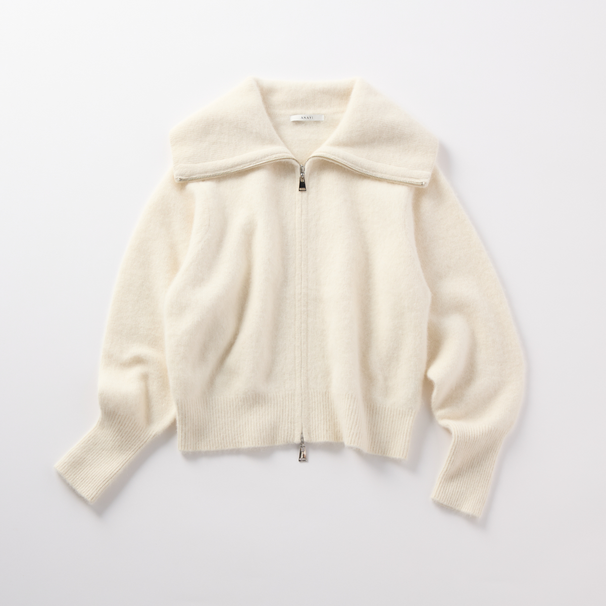 上質なアルパカをミックスしたふんわりとした風合いに仕上げられたジップアップカーディガン。大きな衿と淡いホワイトカラーが女性らしい印象を与えてくれます。冬はカーディガン感覚で羽織れ、肌寒さを感じる春秋はアウターとしても大活躍してくれそう。ジップアップニット¥45,100(ANAYI)