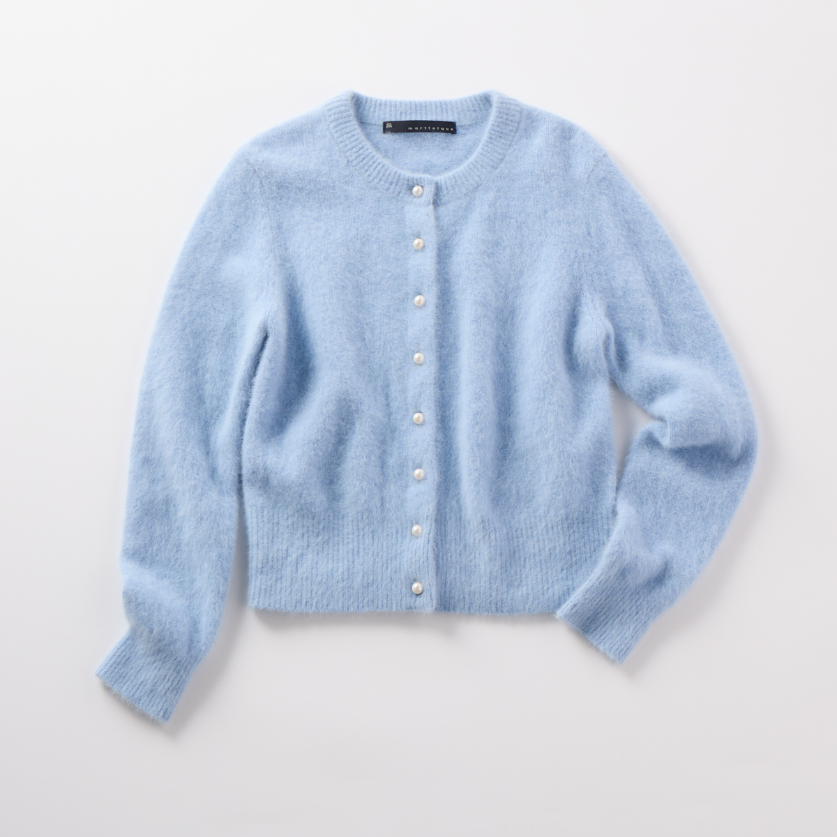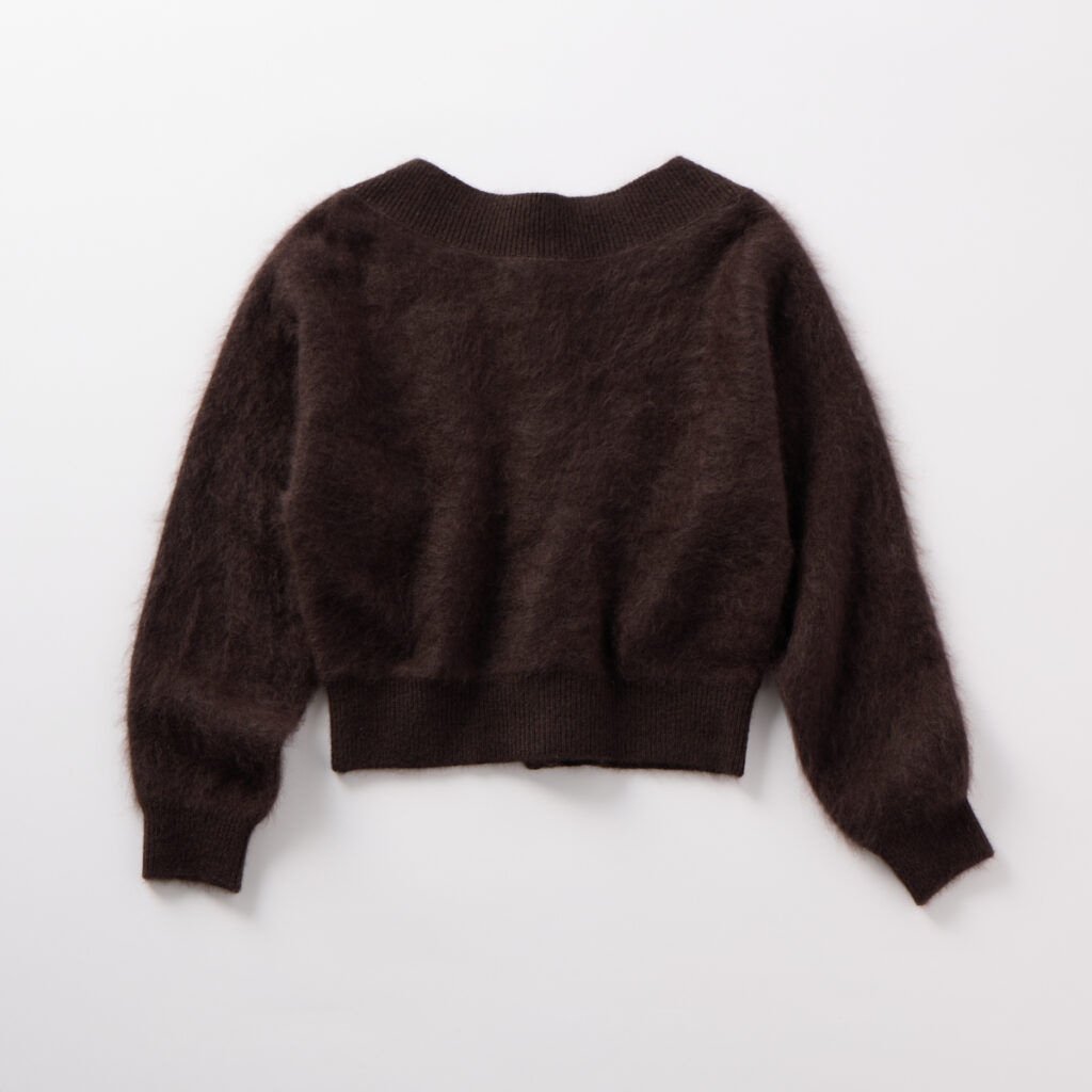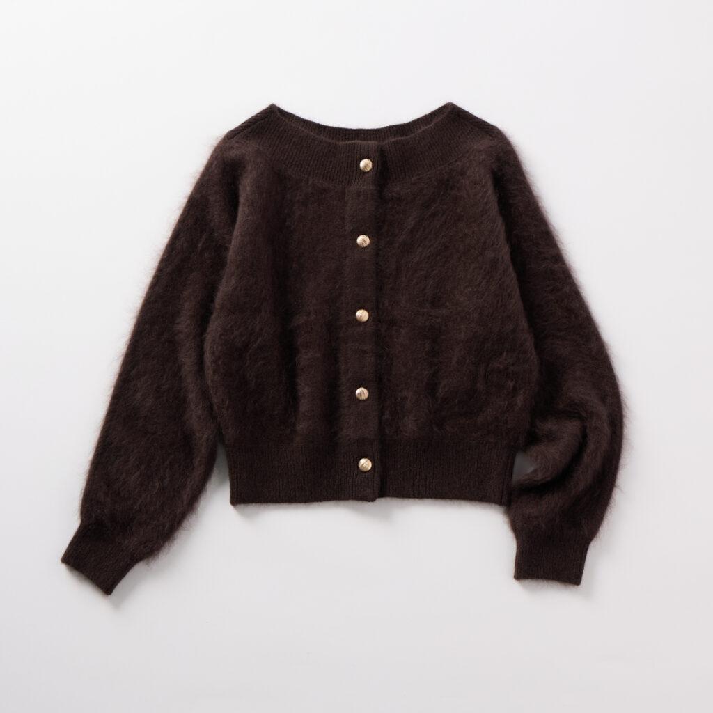 フロントにパールボタンがキレイに並んだラグジュアリーな一枚。FOXの毛並みが豊かなカシミヤ混の高級糸で、肌あたりがやわらかでチクチクせず、それでいて暖かな保温力の高い素材を使用しています。カーディガン¥31,900(マルティニーク/マルティニーク ルミネ横浜)