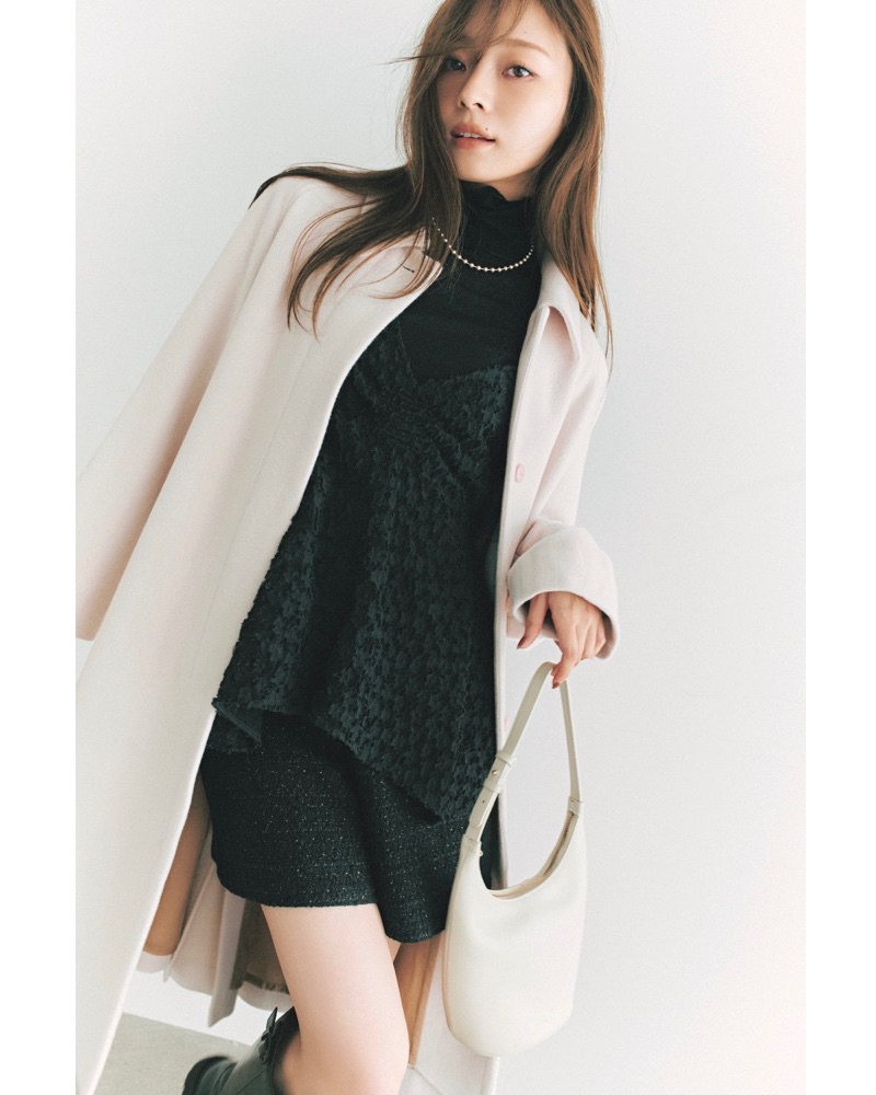 カットソー¥9,900(エリオポール/エリオポール代官山)キャミソール¥38,500(カレンソロジー/カレンソロジー 新宿)コート¥143,000(ソブ/フィルム)ハーフパンツ¥30,000(シーニュ)ネックレス¥68,200(リューク)バッグ¥33,000(ROH SEOUL)ブーツ¥33,000(ランバン オン ブルー/モーダ・クレア)