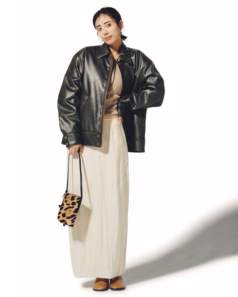 1月18日(日)、オーバーサイズのブルゾンは、上重心を意識するだけでぐっと今っぽいバランスに。ボトムスは白のペンシルスカートで軽やかさを足し、全体は逆三角形のシルエットを意識して。スカートを少し腰履きにすれば、ちらりと覗く肌がこなれ感をプラスしてくれます。強めアウターも女っぽく着地する、休日ならではのスタイリングです。
