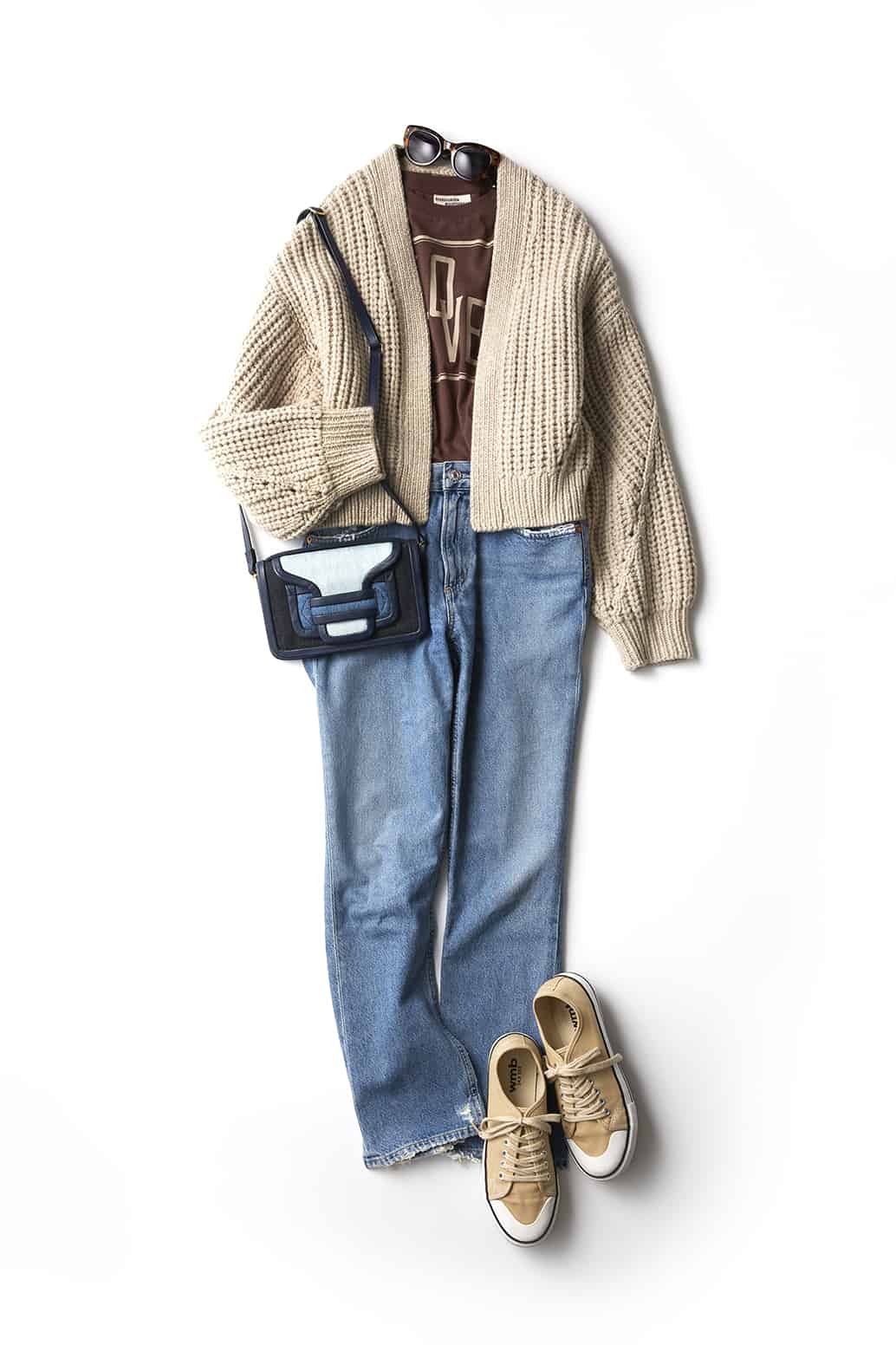 Wクッションキャンバスシューズ¥980(ワークマン)<バルキーカーディガン/カーサ フライン ロゴT/BAUM UND PFERDGARTEN デニム/A GOLDE バッグ/PIERRE HARDY>(すべてスタイリスト私物)
