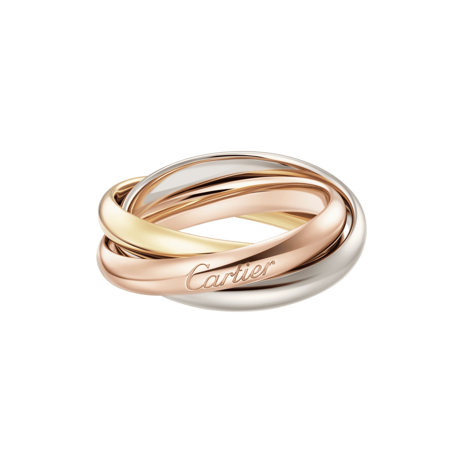 3色のカラーコンビネーションと、しなやかに重なり合う3連の構成で、計算されたボリューム感を実現。骨格ストレートが最も得意とする、シンプルでありながら手元を格上げしてくれる一本です。「トリニティ」リング〈WG×PG×YG〉¥399,900(カルティエ/カルティエ カスタマー サービスセンター)