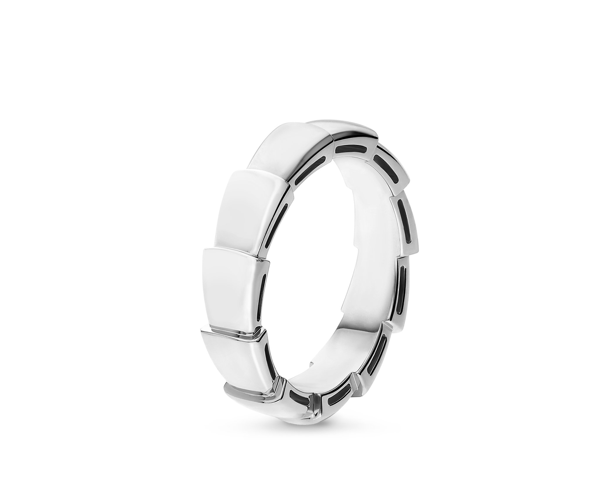 「セルペンティ」はイタリア語での蛇を意味し、規則正しく並ぶうろこのデザインが骨格ストレートにマッチ。ミニマルながらも個性が光るモチーフで、コーディネートのアクセントに。「セルペンティ ヴァイパー」リング〈WG〉¥353,100(ブルガリ/ブルガリ・ジャパン)