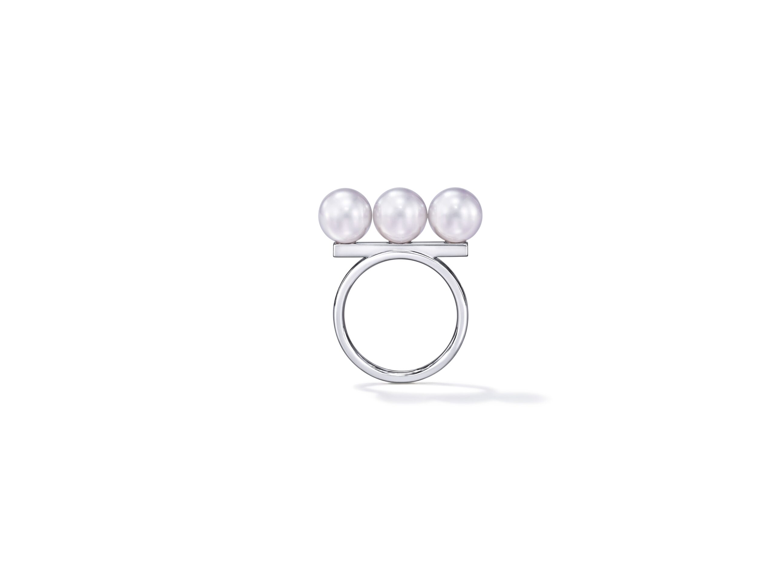 規則正しく並んだデザインが特徴。骨格ストレートの指先を引き締めながら、凛としたパールが気品をもたらします。適度なボリュームと直線的な要素に、女性らしさと存在感を兼ね備えた一本。「バランス ネオ」リング〈WG×あこや真珠〉¥496,100(TASAKI)