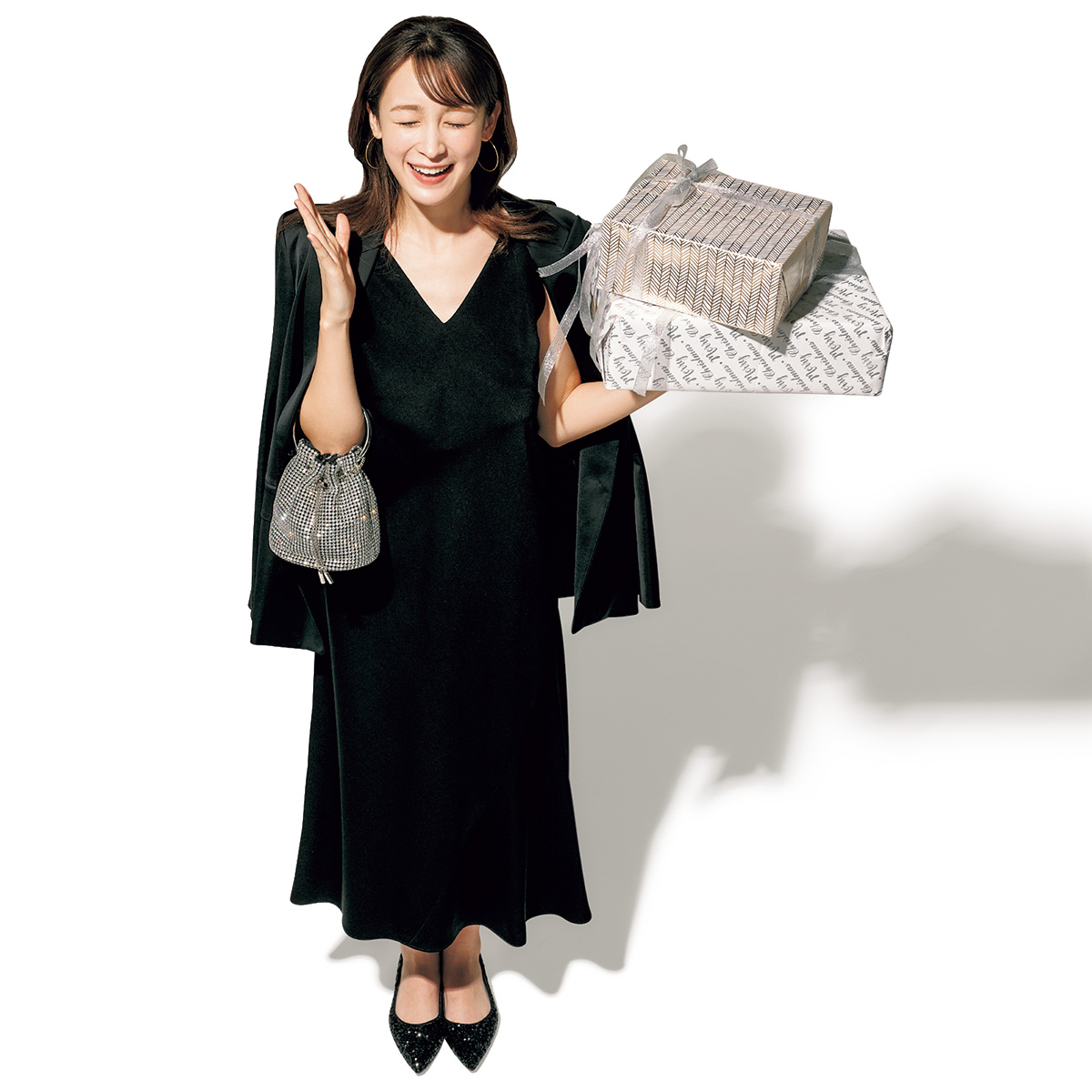 オフィシャルな忘年会にちょうどいい、程よく華やかな普段着を実現。すっきりシルエットで、重ね着してももたつかずスマートに。ワンピース¥36,300(ロンハーマン)トップス¥8,910(ビューティー&ユース╱ビューティー&ユース ユナイテッドアローズ 丸の内店)コート¥154,000(エブール フォー ロンハーマン╱ロンハーマン)バッグ¥220,000(ボナベンチュラ)ブーツ¥89,100(ネブローニ)頭につけたスカーフ¥11,000(マニプリ)ピアス片耳各¥82,500(ともにヒロタカ╱ヒロタカ 表参道ヒルズ)