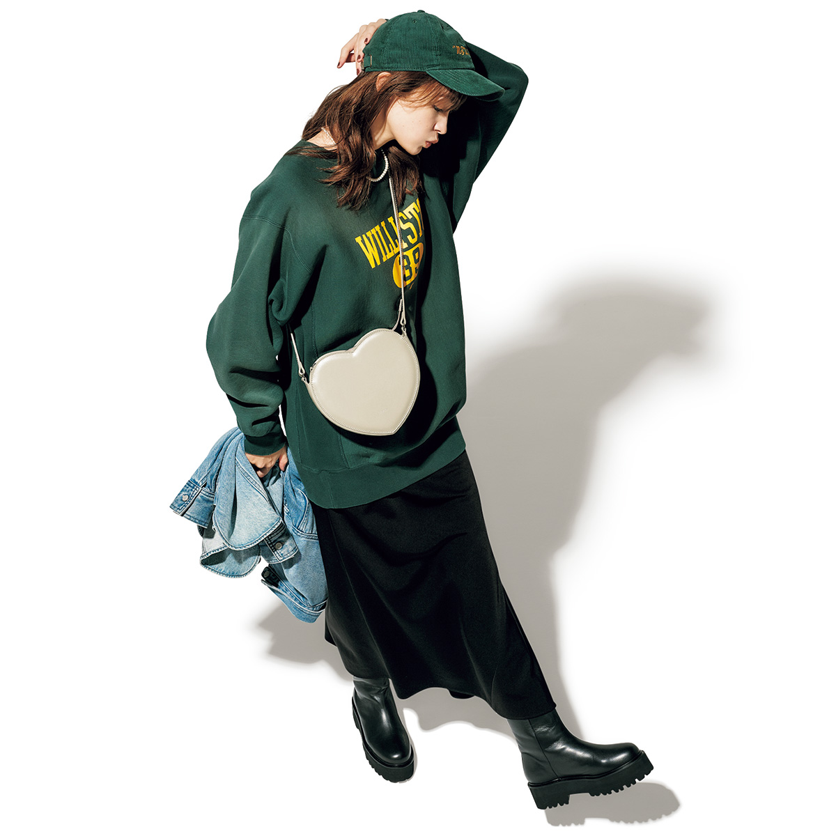 コーデュロイの質感で優しげに。バランスに悩むスカートの日も活躍。カーデより抜け感が出て今っぽく。シャツ¥19,800(MIESROHE╱MIESROHE ルミネ新宿1店)タートル¥14,850(ウィム ガゼット╱ウィム ガゼット ルミネ新宿店)スカート¥34,100(ロンハーマン)バッグ¥107,800(へリュー╱ショールーム セッション)くまチャーム¥5,940(COZY╱セムインターナショナル)ハートチャーム¥9,900(ヴィアメイルバッグ╱アルアバイル)ブーツ¥36,300(オデット エ オディール╱オデット エ オディール 新宿店)