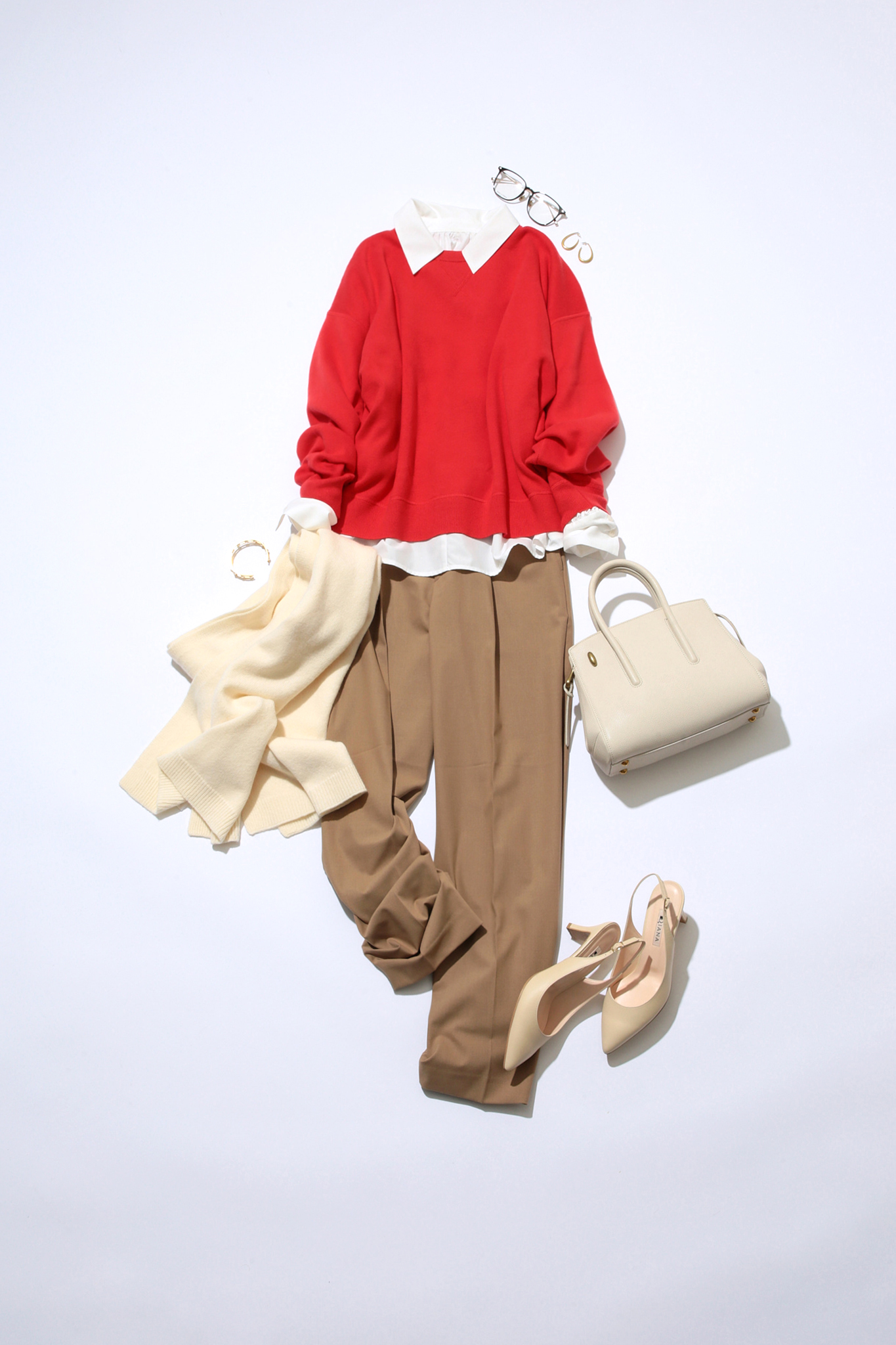 トップスと同じくユニクロのベージュのタックワイドパンツとインナーのシャツ、メガネなどの知的なアイテムを合わせると上品でトラッドば通勤スタイルが完成。バッグやパンプスなどの小物は、「赤×ベージュ」の邪魔をしないホワイト系で統一。
