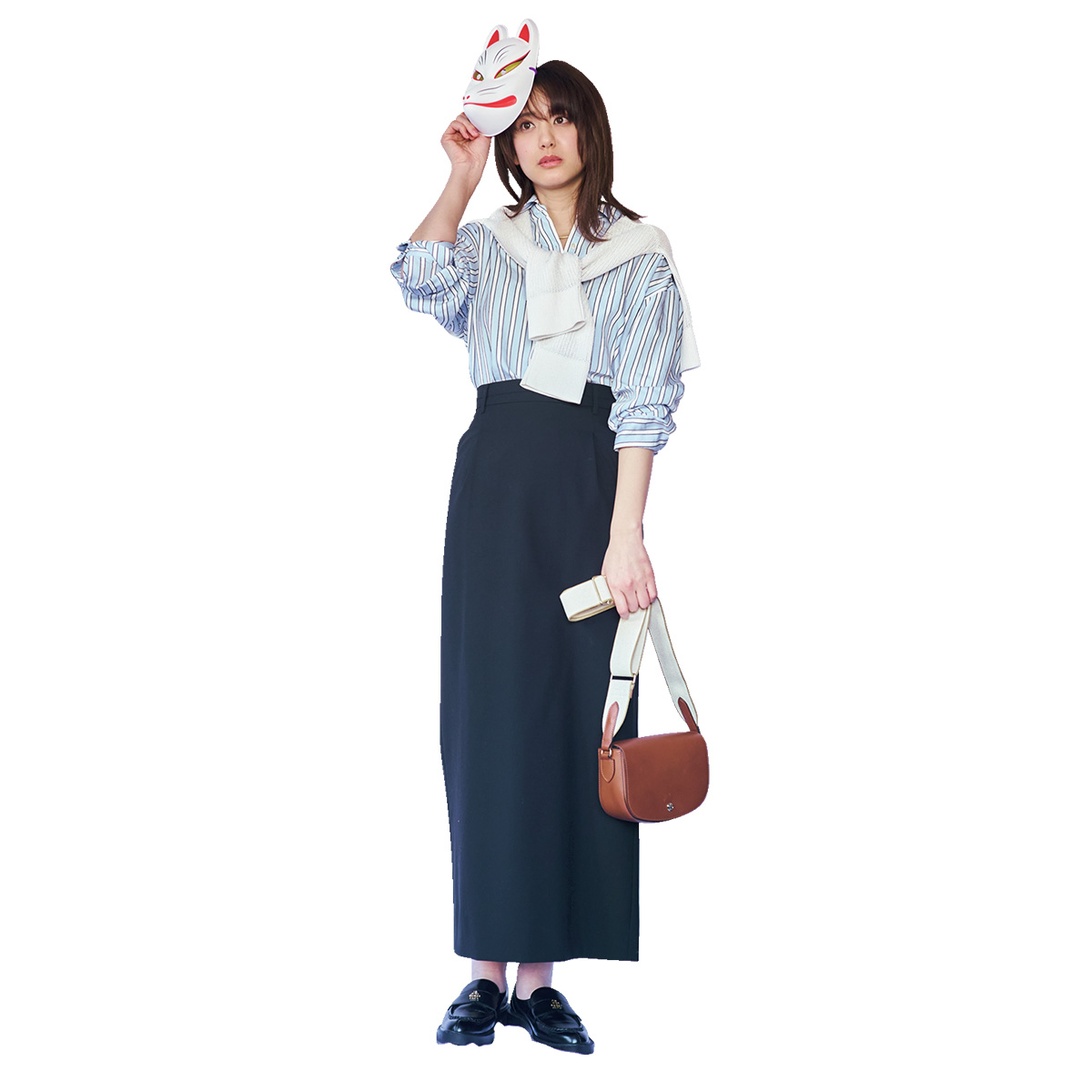 ストライプシャツはタイトスカートのIラインと相性抜群。縦ライン同士が重なることで、すらりとしたシルエットが際立ちます。シャツはインして腰位置を高く見せ、さらに肩掛けカーデで視線を上に誘導すれば、全身のバランスがすっきり。足元は黒ローファーで引き締めて、品のあるトラッドスタイルに。