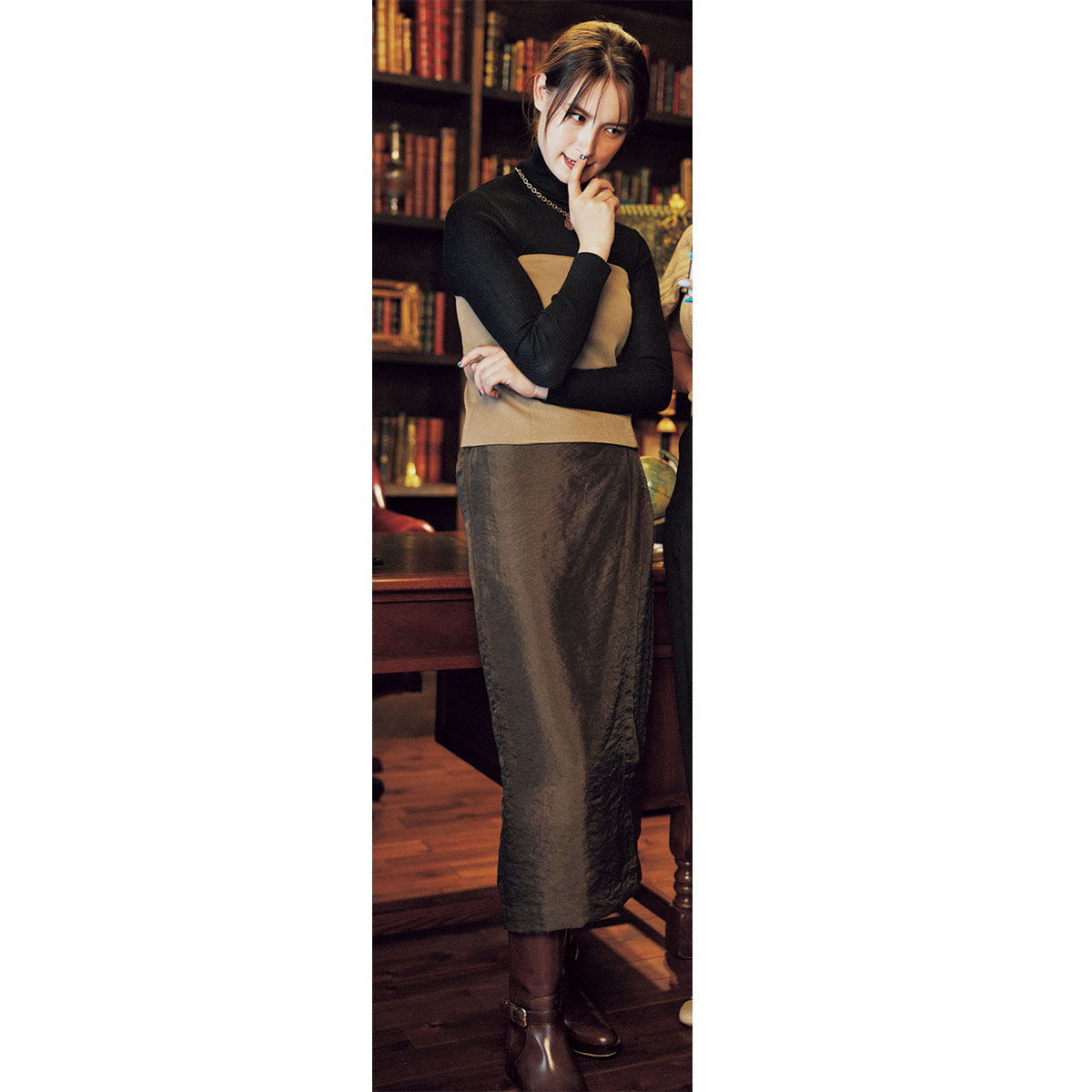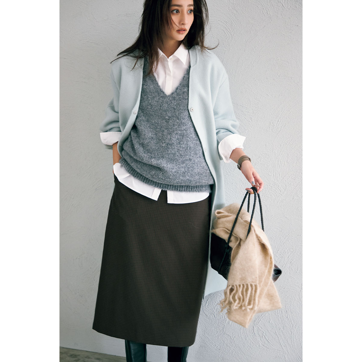 タイトスカートの丈を少しだけ短めにしてみるだけで、グッと新鮮な印象に。今季は半端丈をロングブーツにかぶせる着こなしがトレンドだから、足元までこだわることで一歩差が付きます。シャツ×ニットベストのレイヤードも、タイトスカートのすっきりした縦ラインが受け止めてくれるから重く見えず、スマートに着地。
