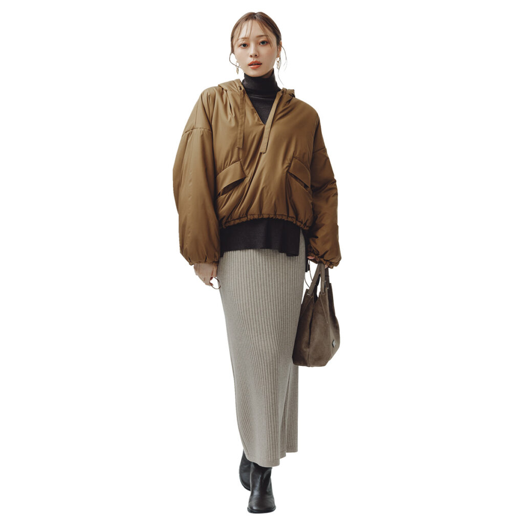 ボリュームアウターが増える冬は、リブ入りのニットスカートが心強い味方。縦ラインのおかげでロング丈でも重く見えず、すっきりした印象にまとまります。短丈アウターで重心を上げれば、よりスタイルよく見える組み合わせに。足元はブーツでほどよく重さを出して、カジュアルに寄りすぎない大人のバランスに。