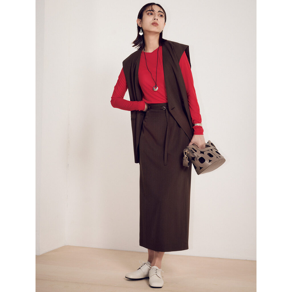 赤のトップスを効かせた着こなしは、タイトスカートが縦ラインを強めてくれるから、大胆な色合わせでもすっきりまとまります。ジレを重ねることで上半身に立体感が生まれ、コンサバに寄りすぎず洒落た雰囲気に。足元は白のレースアップで軽やかさを添えれば、色の強さを上品に受け止める大人のキレイめカジュアルが完成。