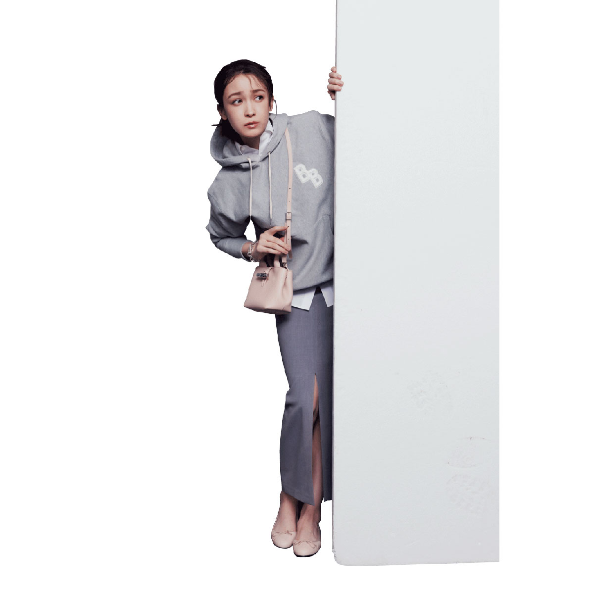 スウェットを品よく着たいと思ったら、タイトスカートの出番。グレー同士のワントーンでも、前スリット入りのデザインなら真面目に寄りすぎず、ほどよい女っぽさをキープ。白シャツをのぞかせること奥行きが生まれ、淡色でもぼんやり見えず装い全体が引き締まります。