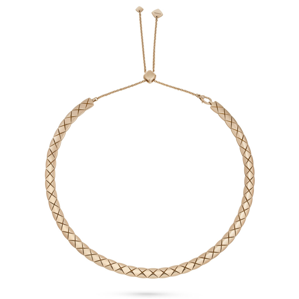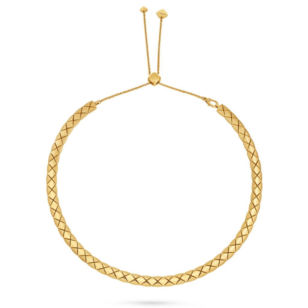 キルティングモチーフをメッシュ状につなぎ、スライディングシステムを採用することで、快適なフィット感と自由な長さ調整を実現。ベージュゴールド、イエローゴールド、ダイヤモンドをあしらったホワイトゴールドの3種が揃い、ミニマルでありながら確かな存在感を放ちます。