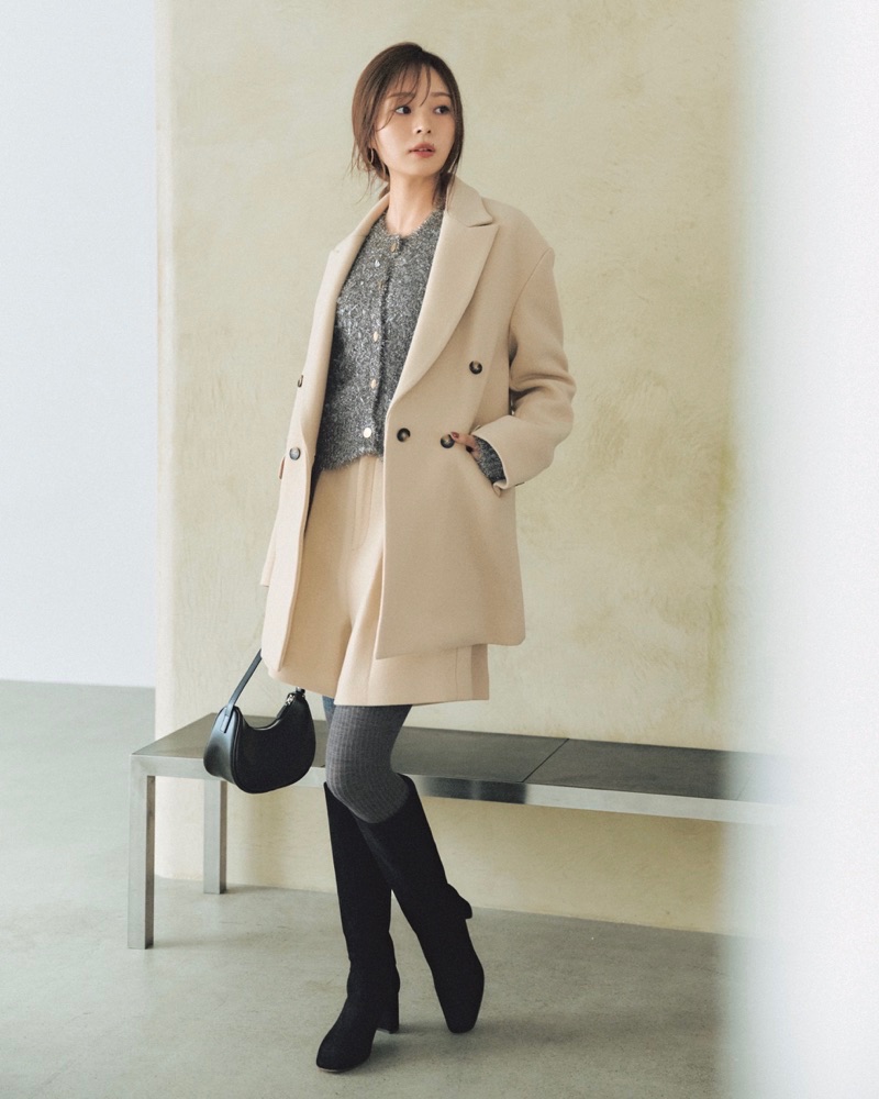 カーディガン¥23,100(カデュネ/カデュネ プレスルーム)ジャケット¥63,800ハーフパンツ¥28,600(ともにランバン オン ブルー)ピアス¥37,400(マリハ)バッグ¥27,500(ヤーキ/ヤーキ オンラインストア)タイツ¥5,940(マルコモンド)ブーツ¥42,900(ダイアナ/ダイアナ 銀座本店)