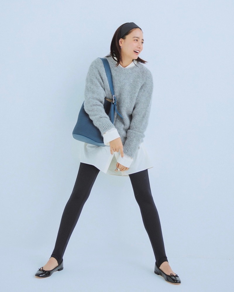レギンス¥5,940(ニューバランス/ニューバランスジャパンお客様相談室)ニット¥38,500(スローン/ザ ショップ スローン 新静岡セノバ店)シャツ※メンズ¥28,600(アモーメント)バッグ¥198,000(J&M DAVIDSON/J&M デヴィッドソン カスタマーセンター)靴¥57,200(レペット/ルック ブティック事業部)ヘアバンド¥23,100(LELET NY/THE HAIR BAR TOKYO)ピアス¥74,800リング[右手]¥58,300(ともにココシュニック)リング[左手]¥39,600(スクア)