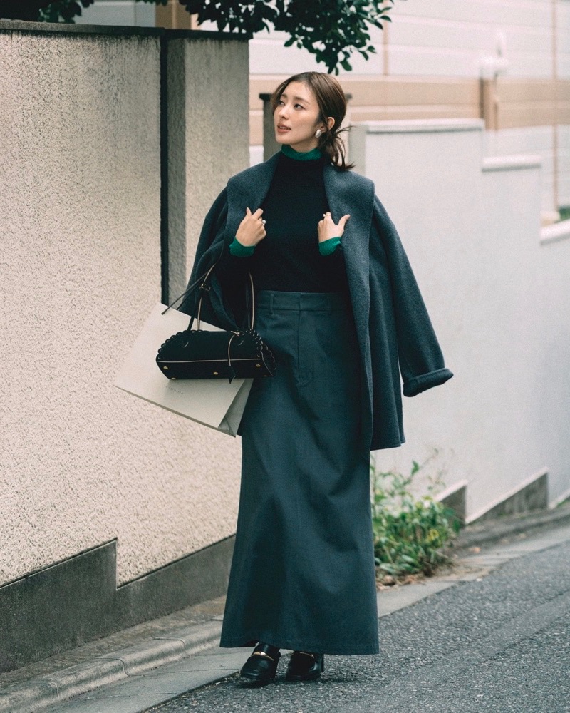 1月24日(土)、冬に増えがちな黒コーデにシャレっぽさを足すなら、黒タートルにタートルを重ねてグリーンを差し色に。首元と袖口からちらりと見えるグリーンが黒の重さを中和し、着慣れたワンツーも華やかに更新してくれます。トップスがコンパクトな分、ボトムスはロングスカートでメリハリを。ダークトーンでも素材感とシルエットで重たくならず、週末のきれいめにちょうどいいバランスに。