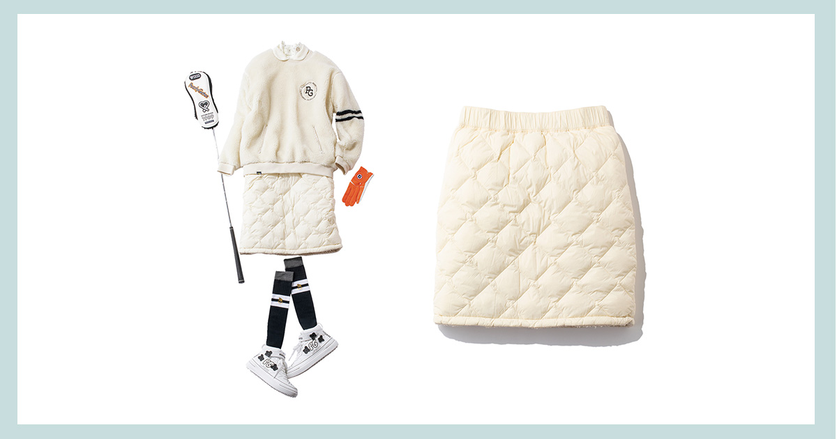 リバーシブルダウンスカート¥9,900(タイオン/ジョワイユ)ボアトップス¥29,700ソックス¥4,180シューズ¥44,000ヘッドカバー¥9,240(すべてパーリーゲイツ)ニットポロシャツ¥33,000(スローン╱ザ ショップ スローン 新静岡セノバ店)モックネックトップス¥17,600(セント・アンドリュース)グローブ¥3,080(フットジョイ╱アクシネット ジャパン インク)
