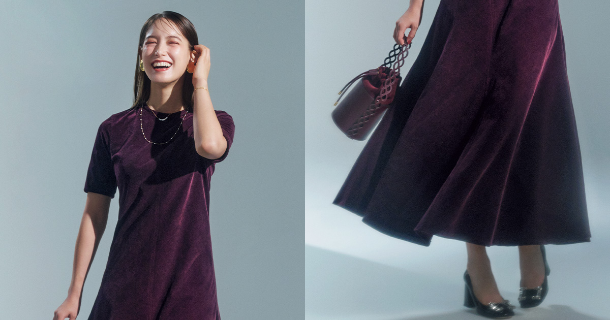 季節が移ろいクローゼットに増えるのはダークカラー。でも、祝福の場には定番のパステルのくすみカラーが似合うし安心…そう思っていたけれど、なんとなくワードローブから浮いて見える。そんな気持ちが芽生えたら、冬らしいこっくりした色味のカラーワンピースに更新を。深みのある色が、肌の透明感を引き立て、淡色にはない“余裕”と“品”を演出してくれます。小物で軽やかさを添えれば、重たくなりすぎずに絶妙なバランスが生まれます。